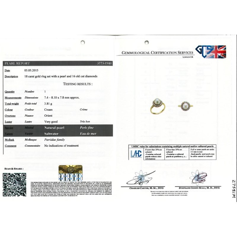 Accompanied by report number 5775-1940 dated 5 May 2015 from GCS, London stating that the cream pearl measures 7.4 0 8.10 x 7.8mm and is natural saltwater with no indications of treatment.