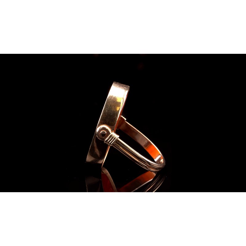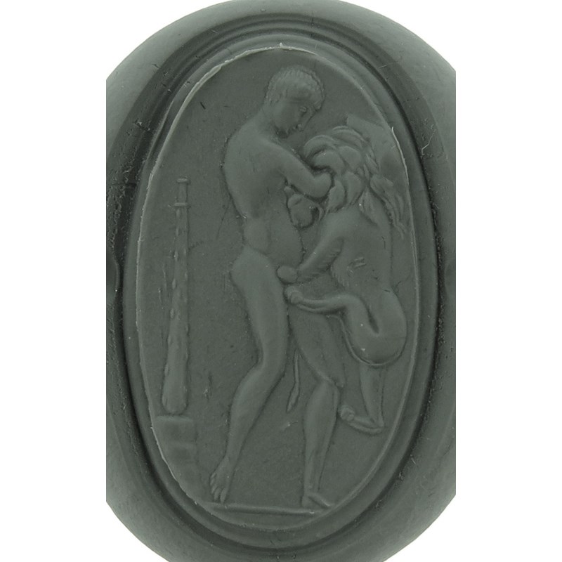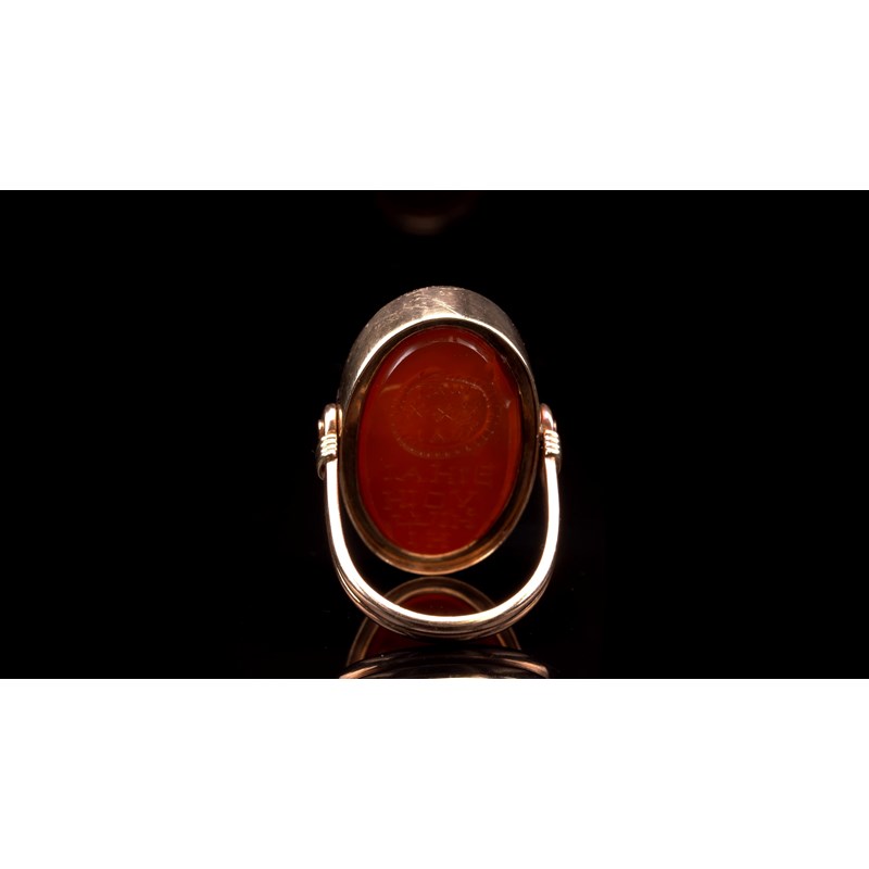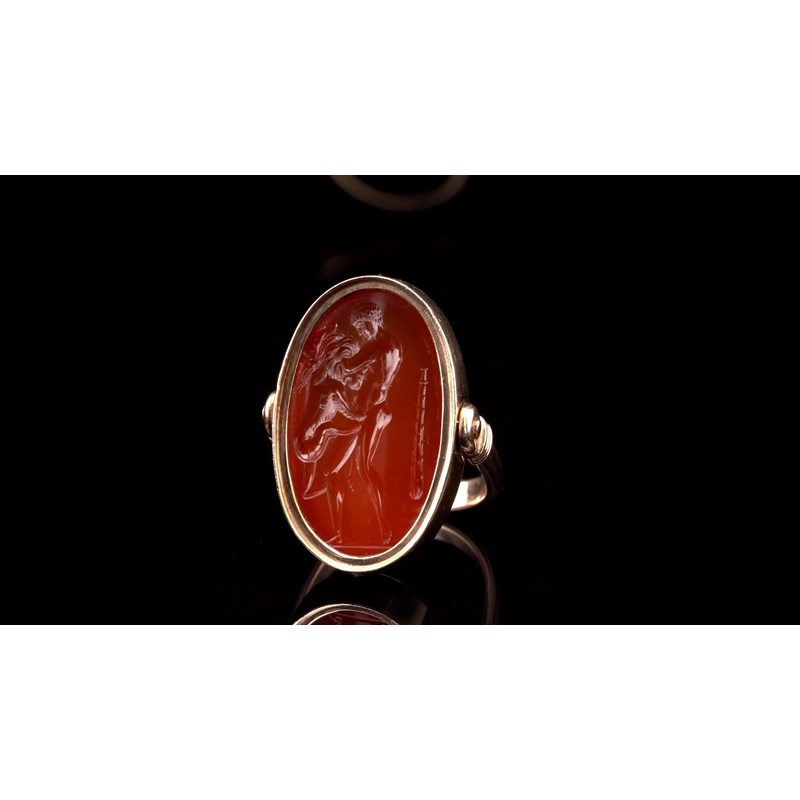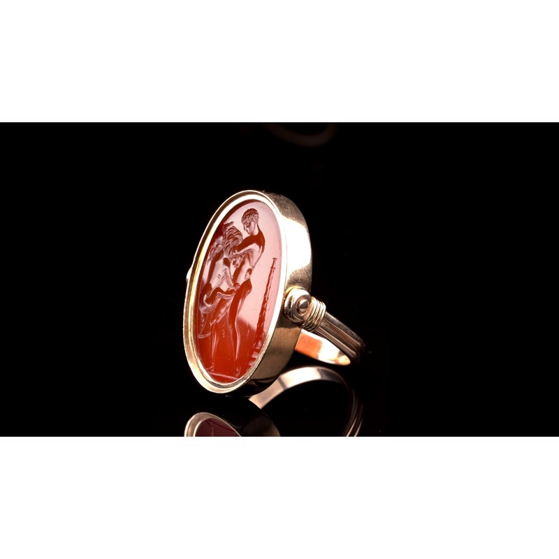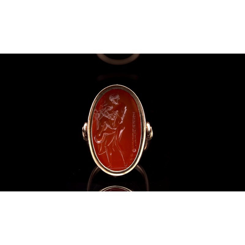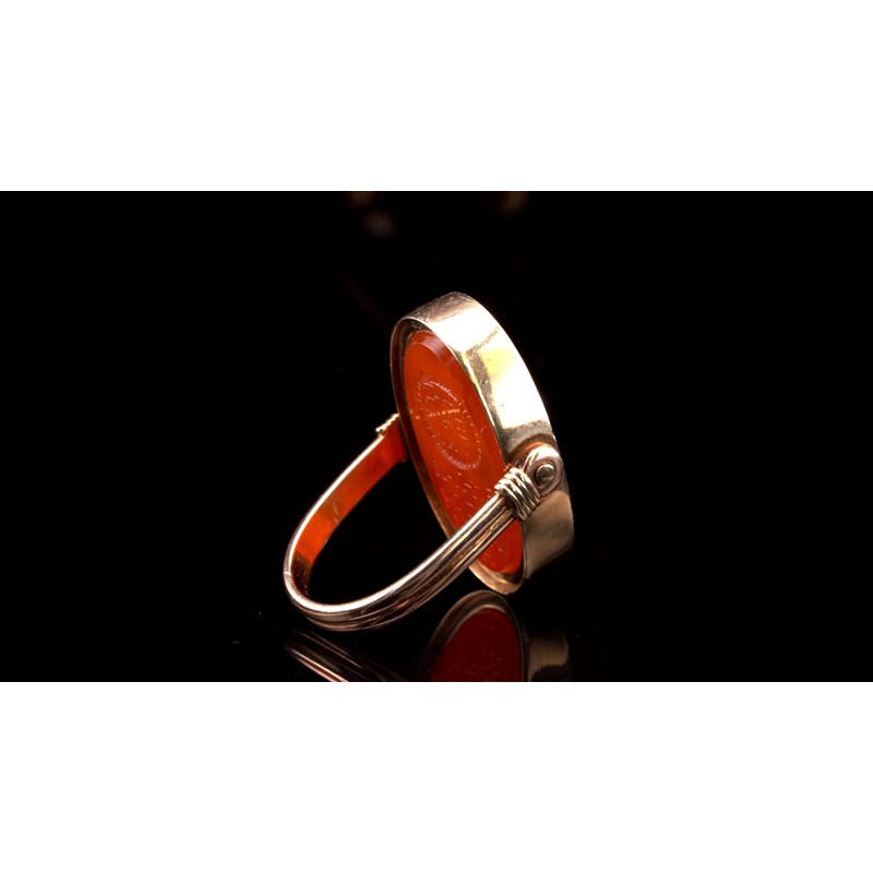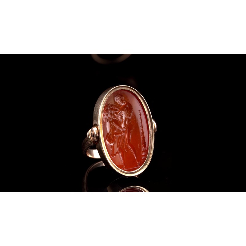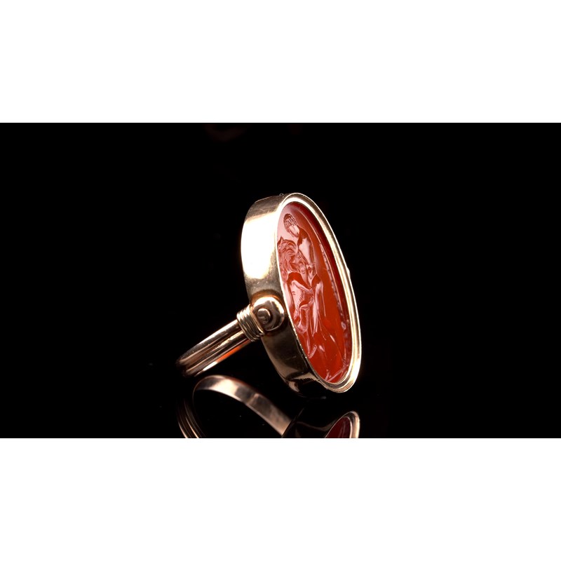 An 18th century two-sided carnelian intaglio, depicting Hercules slaying the Nemean lion with his club standing vertical behind to one side, the other with gnostic carved inscription, one set within a coiled snake border, mounted in an 18th century gold collector's mount, intaglio 2.7cm high, ring size S