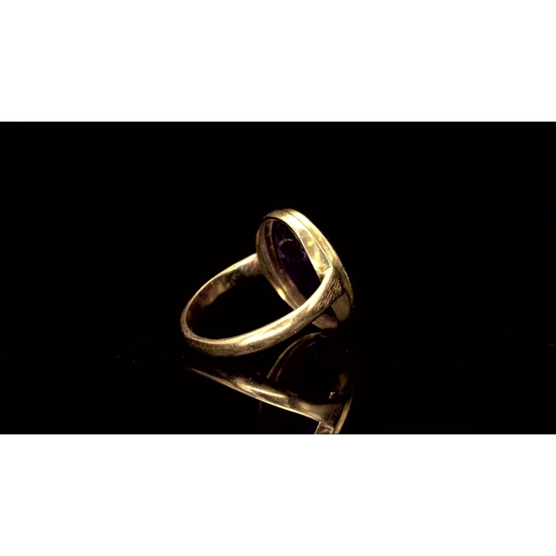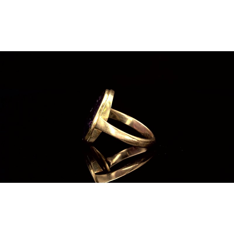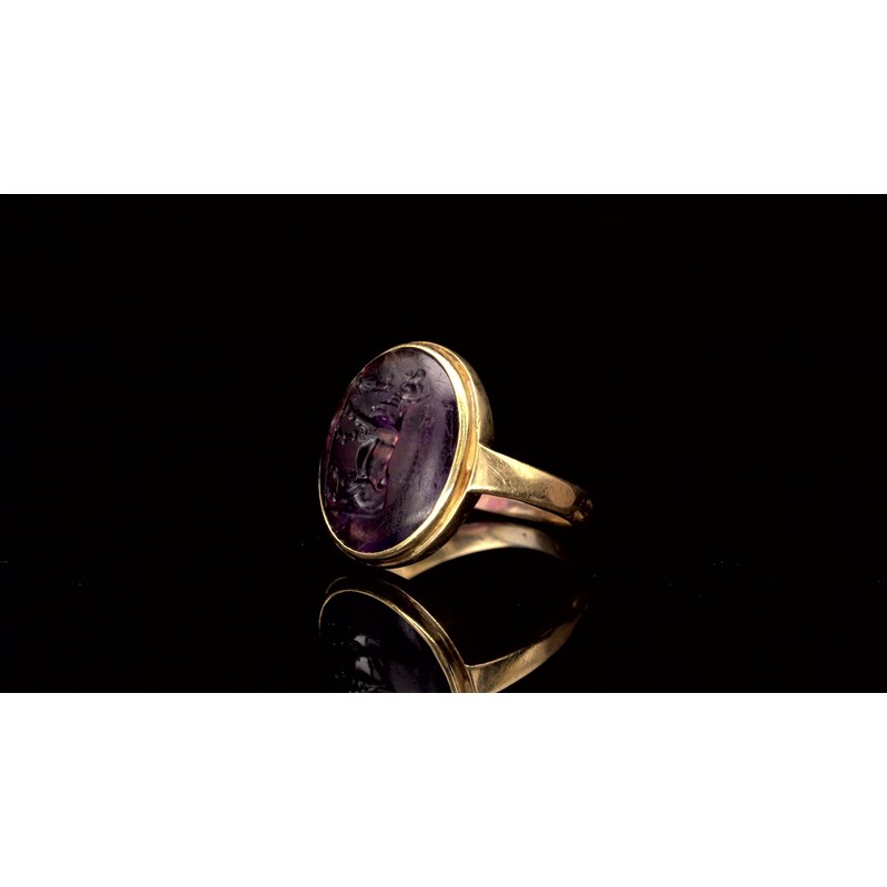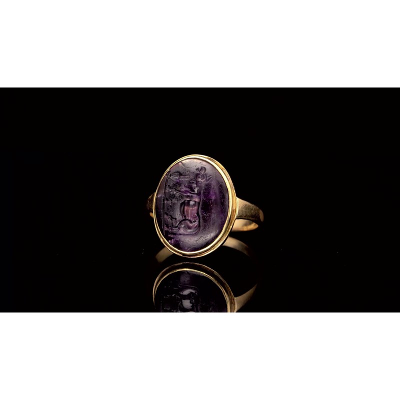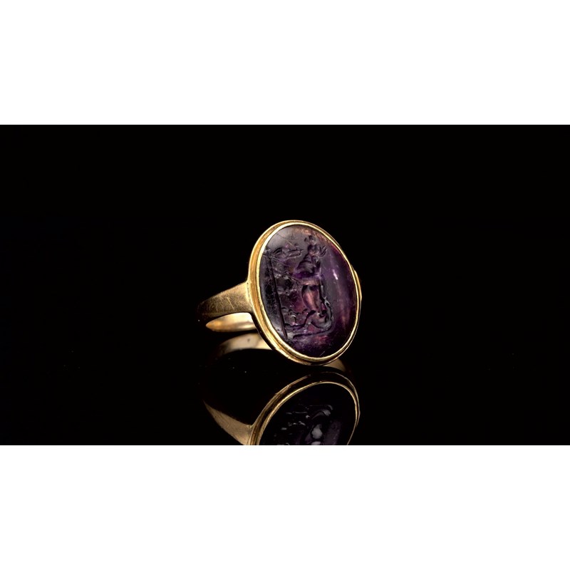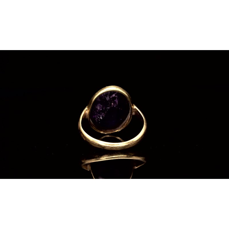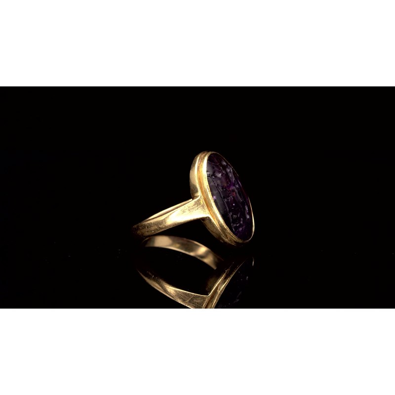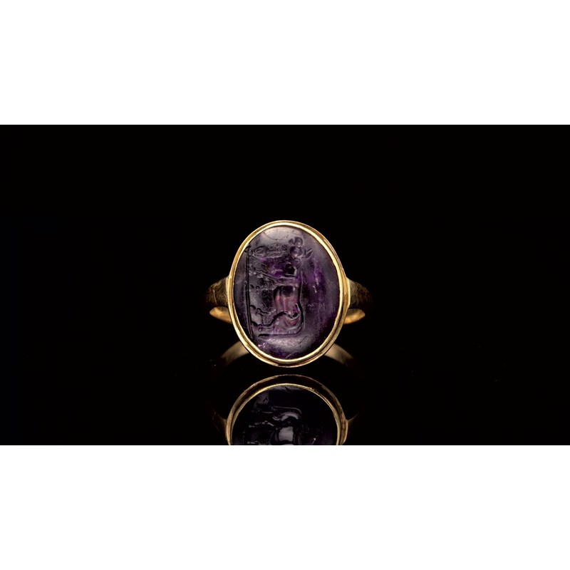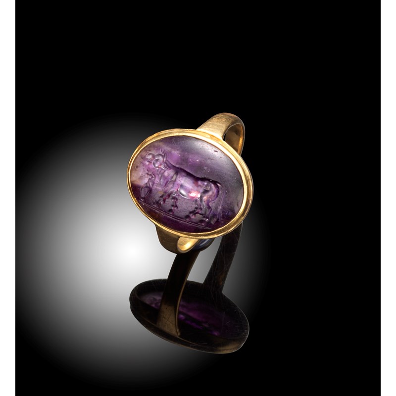 An amethyst intaglio depicting a bull with an urn, c.1st-2nd century BC, in a gold ring mount, intaglio 1.7cm wide, ring size L