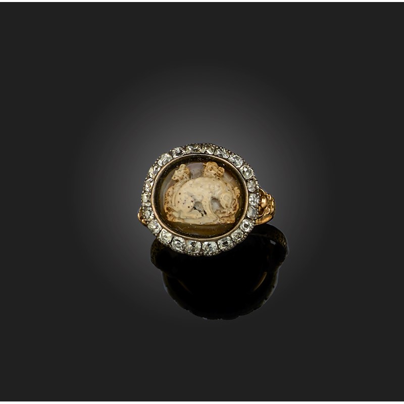 An unusual jasper cameo and diamond ring, 17th/18th century and later, set with an oval speckled jasper cameo depicting three leopards, within a border of cushion-shaped diamonds, to a later ring mount of floral design, mounted in gold and silver, cameo 1.3 x 1.2cm, ring size O, case
