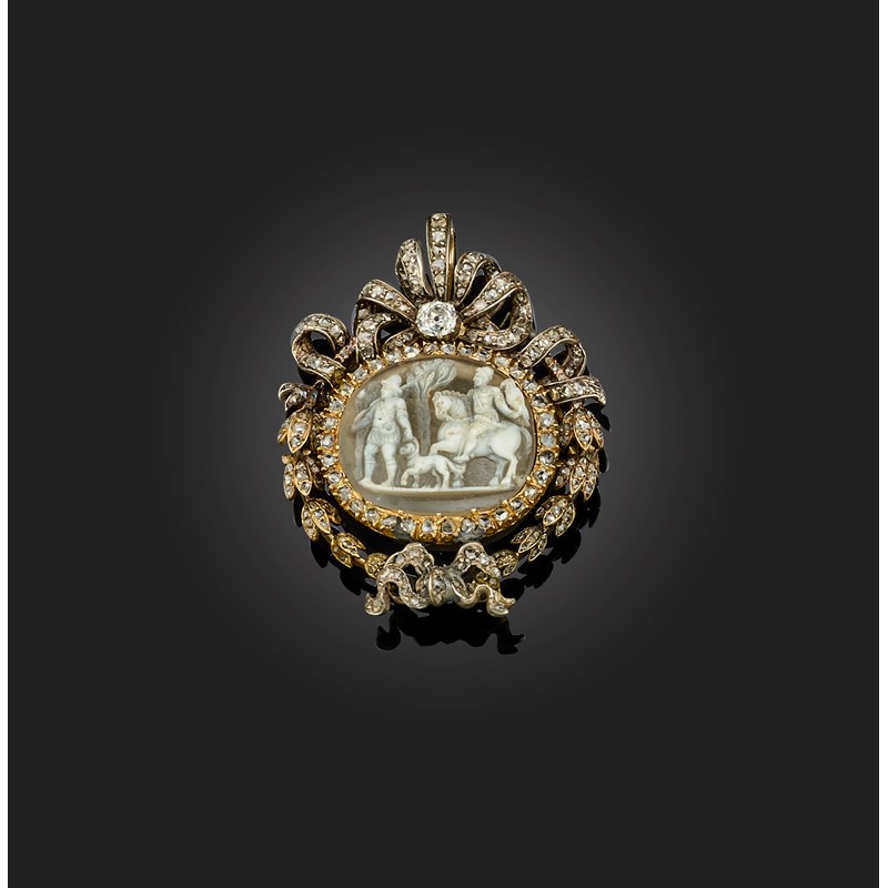 An agate cameo and diamond brooch, Germany, circa 1550, mount circa 1900, set with an agate cameo carved to depict a hunting scene, within a later brooch of ribbon bows and foliate festoons set with rose-cut diamonds and centring on a cushion-shaped diamond, the reverse of the cameo with a glazed compartment, mounted in silver and gold, length 4.3cm, cameo 1.6 x 1.9cm, case