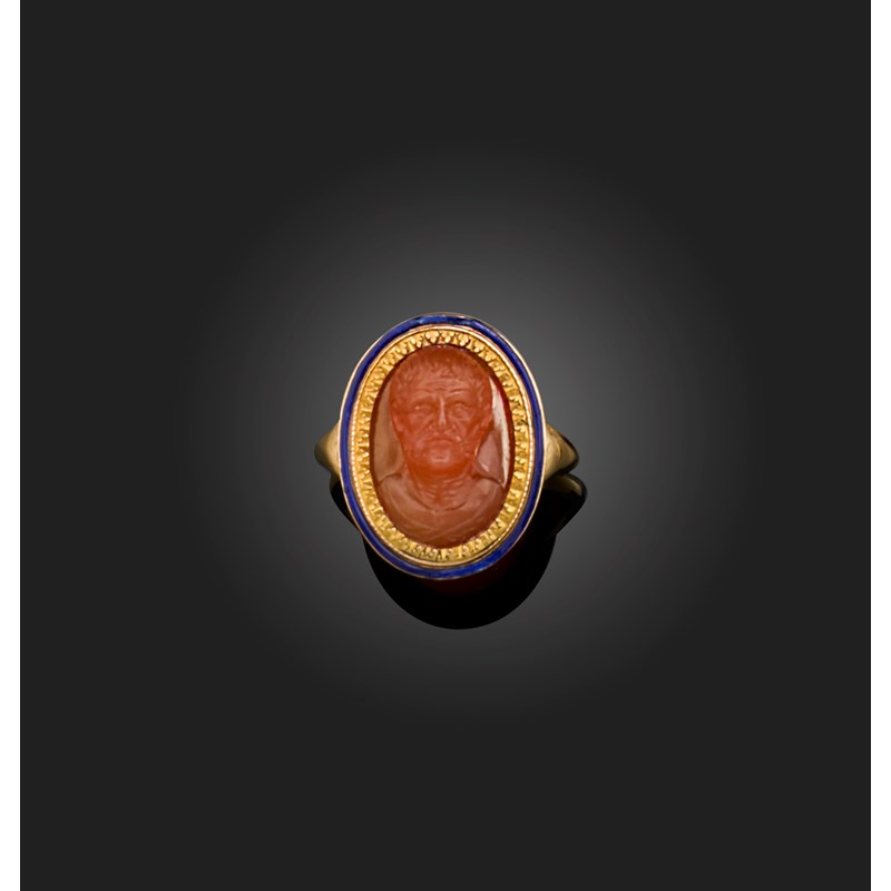 A carnelian and enamel ring, late 18th/early 19th century and later, set with a carnelian cameo depicting a bearded man, possibly Seneca, within an engraved gold border applied with an outer band of blue enamel, later converted to a ring, cameo 1.6 x 1.1cm, ring size P