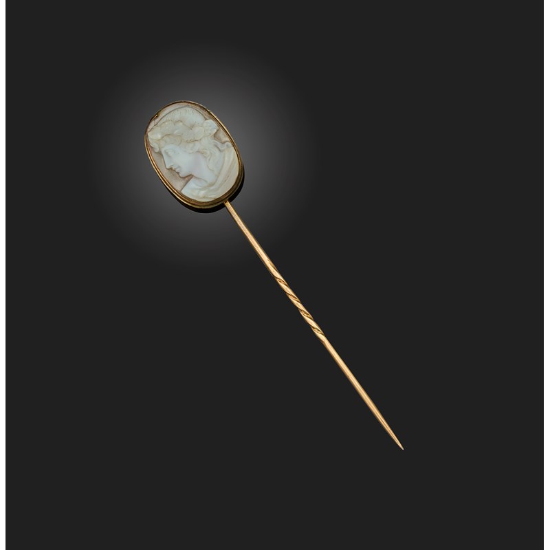 An agate cameo stick pin, 19th century, set with an oval agate cameo depicting a Bacchante, mounted