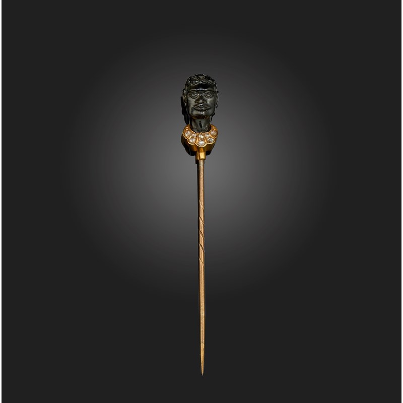 A carved onyx and diamond stickpin, late 19th century, set with a carved onyx head of a 'Blackamoor', in a gold collar set with rose-cut diamonds, the pin of base metal, length 7.5cm