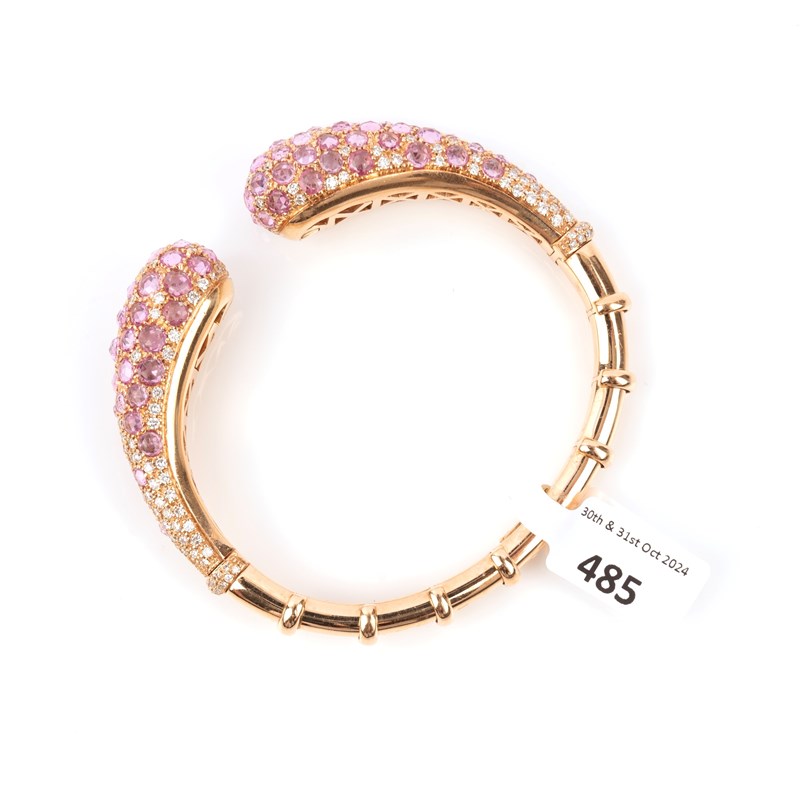 Verdi for Cellini NYC, a pink sapphire and diamond bangle, the open bangle of flexible construction, each end of bombé design, set with rose-cut pink sapphires and brilliant-cut diamonds, mounted in rose gold, inner curve 15.3cm, stamped 750 and 18Kt, Italian maker's mark 1489 MI, maker's mark M, gross weight 42 grams