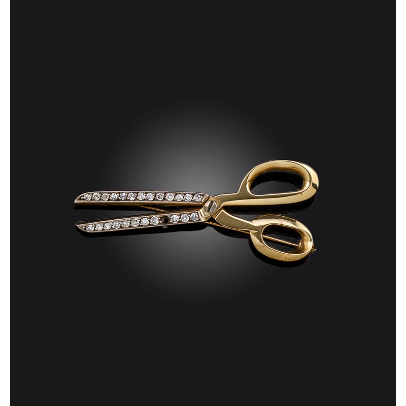 A gold and diamond brooch, designed as a pair of tailor's scissors, the hinged blades set with