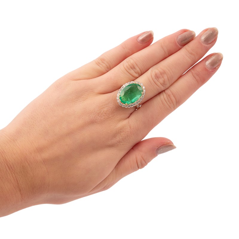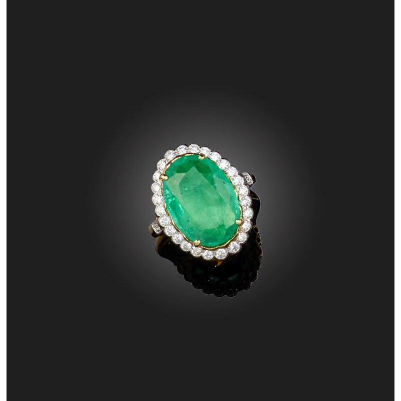 An emerald and diamond ring, of cluster design, claw-set with an oval emerald weighing 6.99 carats, within a border of brilliant-cut diamonds totalling 0.58 carats, mounted in gold, size M1/2, stamped 750