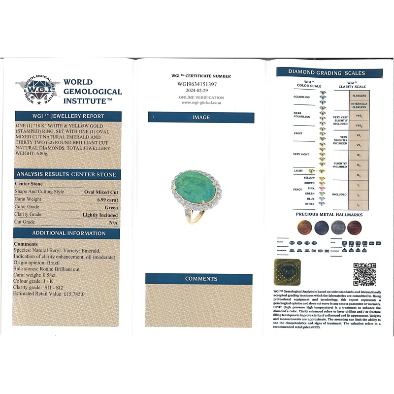 Accompanied by WGI report no. WGI9634151397, dated 29th February 2024, stating that the emerald is Brazilian, weighing 6.99 carats, with evidence of clarity enhancement.