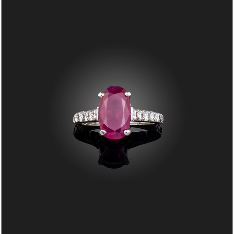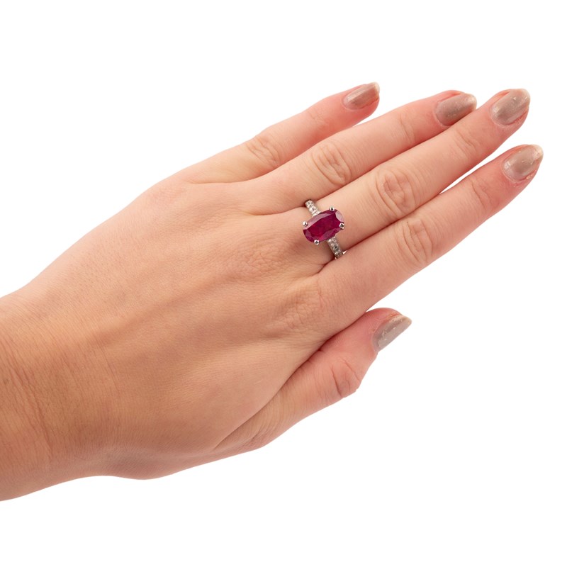 A ruby and diamond ring, claw-set with an oval ruby weighing 4.11 carats, to a band set with brilliant-cut diamonds, mounted in white gold, size K1/2, French assay mark for 18ct gold