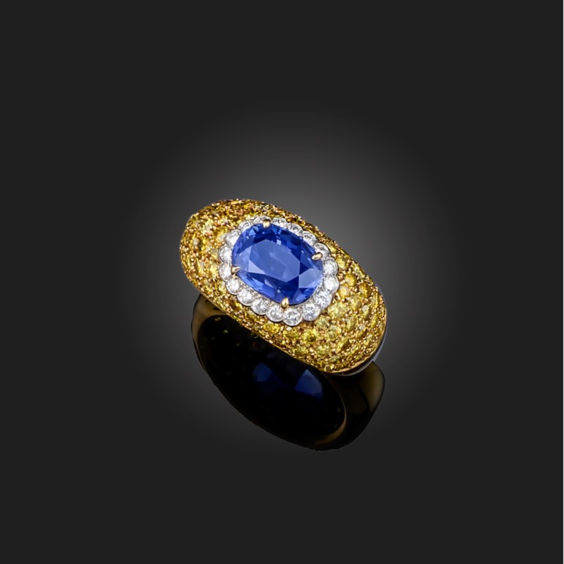 Spink, a sapphire and diamond ring, of bombé design, centred with a cushion-shaped sapphire weighing 3.58cts, in a surround of single-cut diamonds to shoulders pavé-set with fancy yellow diamonds weighing approximately 2.50cts, mounted in 18ct gold, size N, London hallmarks for 1995, stamped Spink 3.58ct and J3785