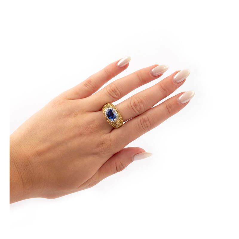 Spink, a sapphire and diamond ring, of bombé design, centred with a cushion-shaped sapphire weighing