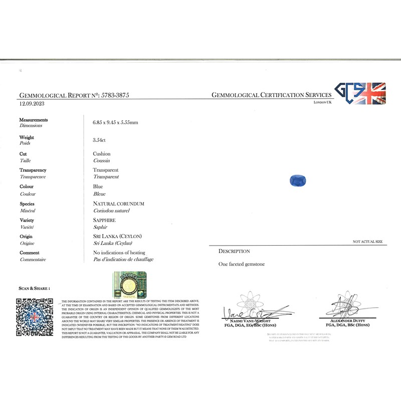Accompanied by GCS report no. 5783-3875, dated 12th September 2023, stating that the sapphire is of Sri Lankan (Ceylon) origin, with no evidence of heat treatment.
