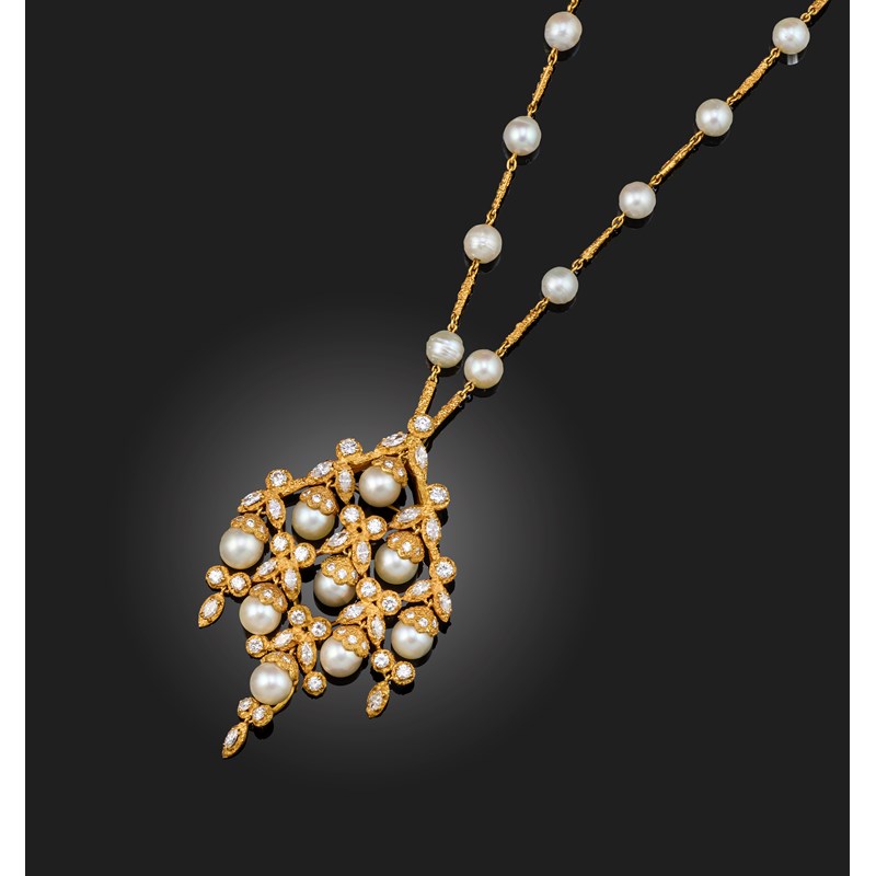 An abstract cultured pearl necklace, the detachable brooch pendant of chequerboard design suspending articulated cultured pearls within a textured yellow gold design set with diamonds, suspending from a cultured pearl and yellow gold necklace, chain length 70cm, pendant length 8.5cm