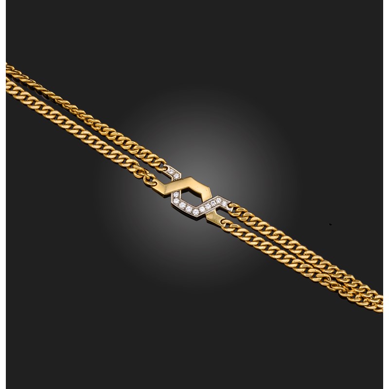 Van Cleef & Arpels, a gold and diamond necklace, centring on a geometric motif set with brilliant-cut diamonds, to a double strand curb link chain necklace, mounted in gold, length 38.5cm, signed VCA, numbered K62.2, stamped 18K Italy, gross weight 75 grams