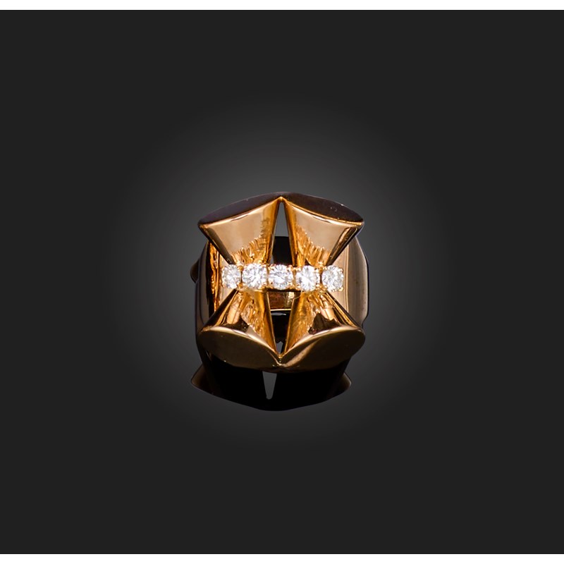 A French Odeonesque ring, the stylised bow joined with a row of circular-cut diamonds in 18ct gold, French control marks and partial maker's mark, approximately size N
