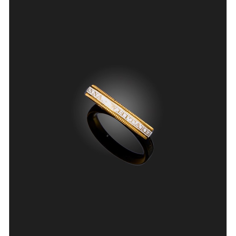 A rare gold and enamel mourning ring, circa 1779, applied with white enamel, the memorial inscription 'ANNA WHITAKER OB 10 SEP 1779 AE 11', mounted in gold, size L, maker's mark RH
