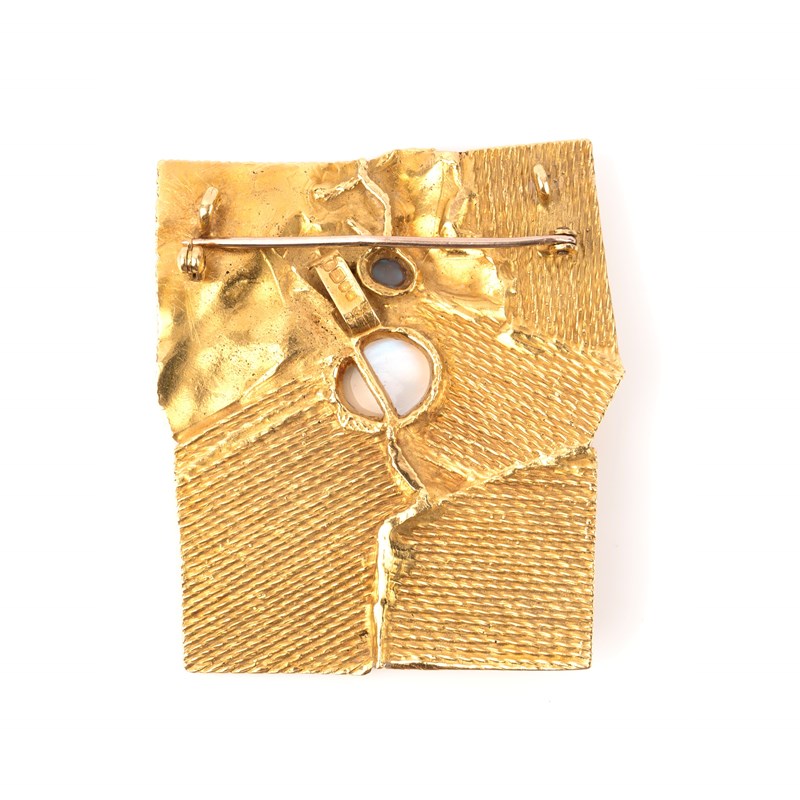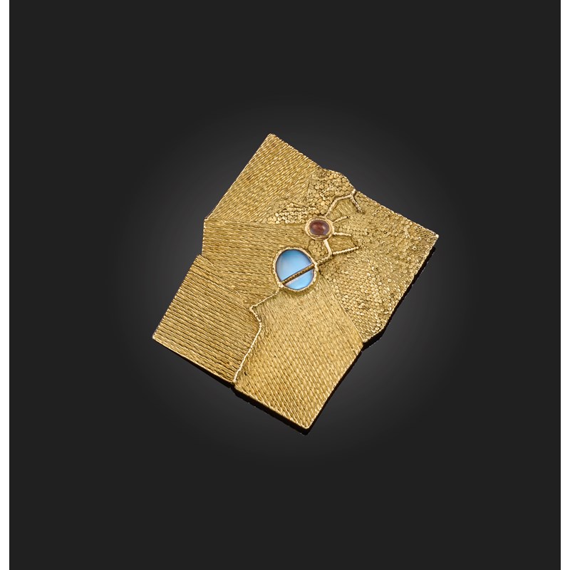 Φ Jacqueline Gruber Stieger, a gold and moonstone brooch/pendant, 1977, designed as a segmented textured panel set with oval and semi-circular opal cabochons, maker's mark AGS, London hallmarks, length 5.8cm