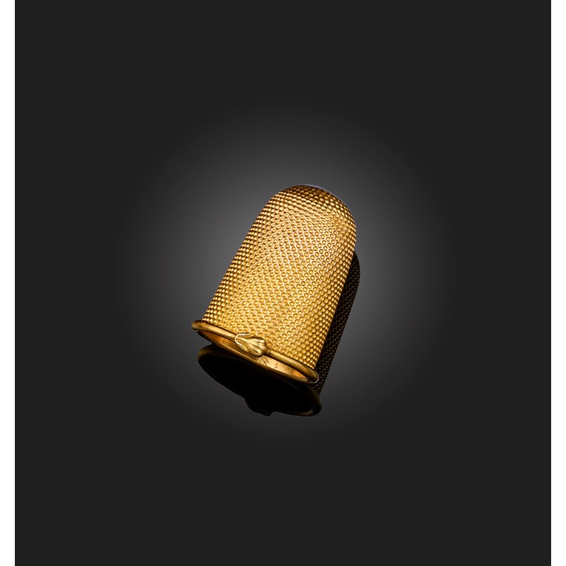 Eugène Fontenay, a gold thimble, France, 19th century, of textured finish, the edge designed as a snake biting its own tail symbolising eternity, length 2.2cm, French assay mark for 18ct gold, French maker's mark EF with tea urn for Eugène Fontenay, gross weight 6.3 grams