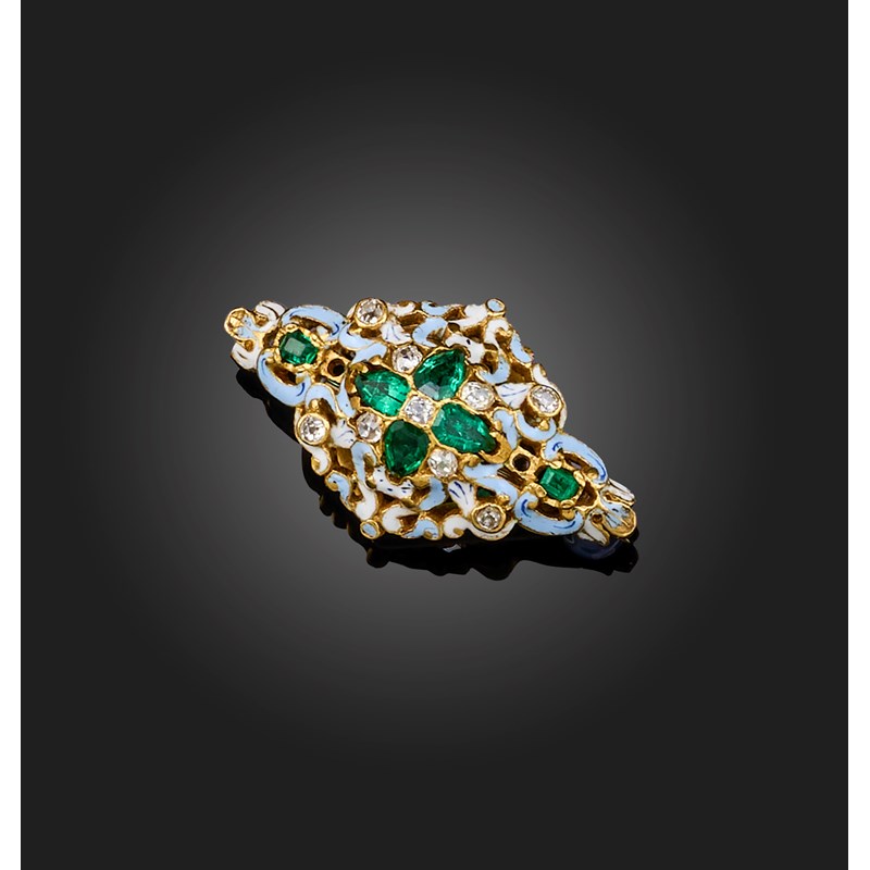 An emerald, enamel and diamond brooch, mid 19th century, designed in the Renaissance revival style,