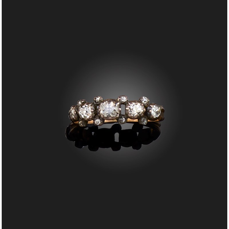 A diamond ring, late 18th/early 19th century, the front set with a line of cushion-shaped diamonds in closed back settings, spaced by pairs of smaller cushion-shaped diamonds, mounted in silver and gold, size M1/2