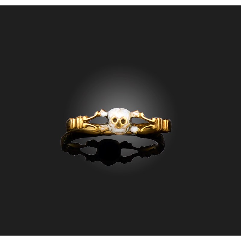 An unusual George II enamel and gold memento mori mourning ring, circa 1730, centring on a skull and
