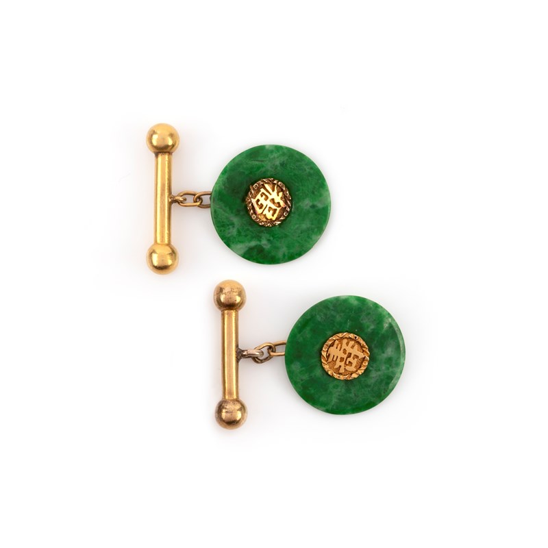 A pair of gold and jadeite cufflinks, the front section of each set with a disc of polished jadeite, centring on Chinese characters meaning 'good fortune' and 'longevity' in gold, the back links of bar design, connected by chain linking, fronts each 1.8cm diameter, one broken and restuck
