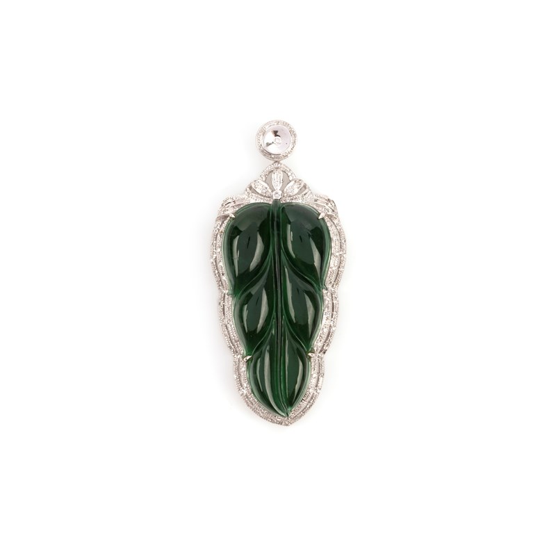 A jadeite and diamond pendant, of foliate design, set with a carved section of jadeite within a white gold mount accented with single- and brilliant-cut diamonds, length 4.3cm