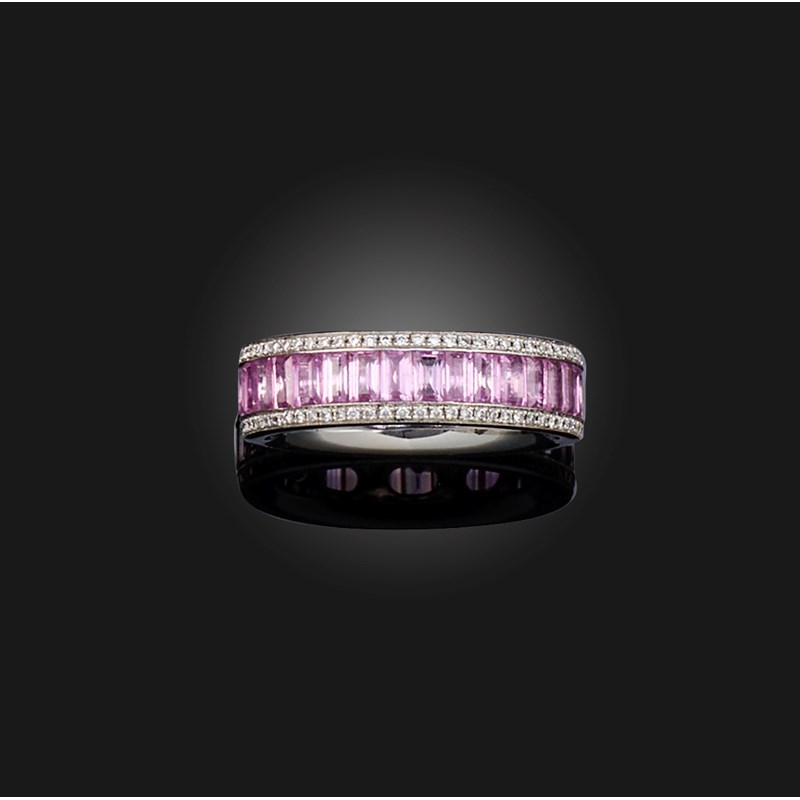 A pink sapphire and diamond eternity ring, channel-set with step-cut pink sapphires within