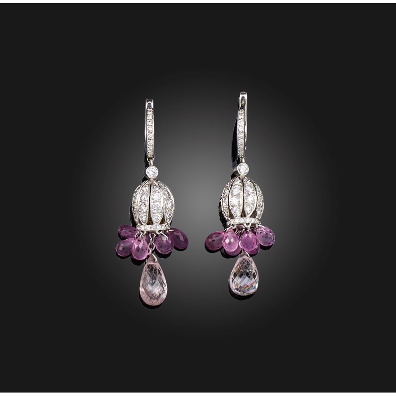 A pair of pink sapphire and diamond earrings, each designed as a tassel of pink sapphire briolettes suspended from a floral surmount set with brilliant-cut diamonds, mounted in platinum, length 3.7cm each, post fittings