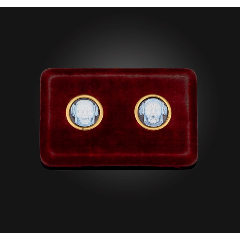 Cartier, a rare pair of onyx cameos and frame, 1870s, the two onyx cameos depicting the masks of