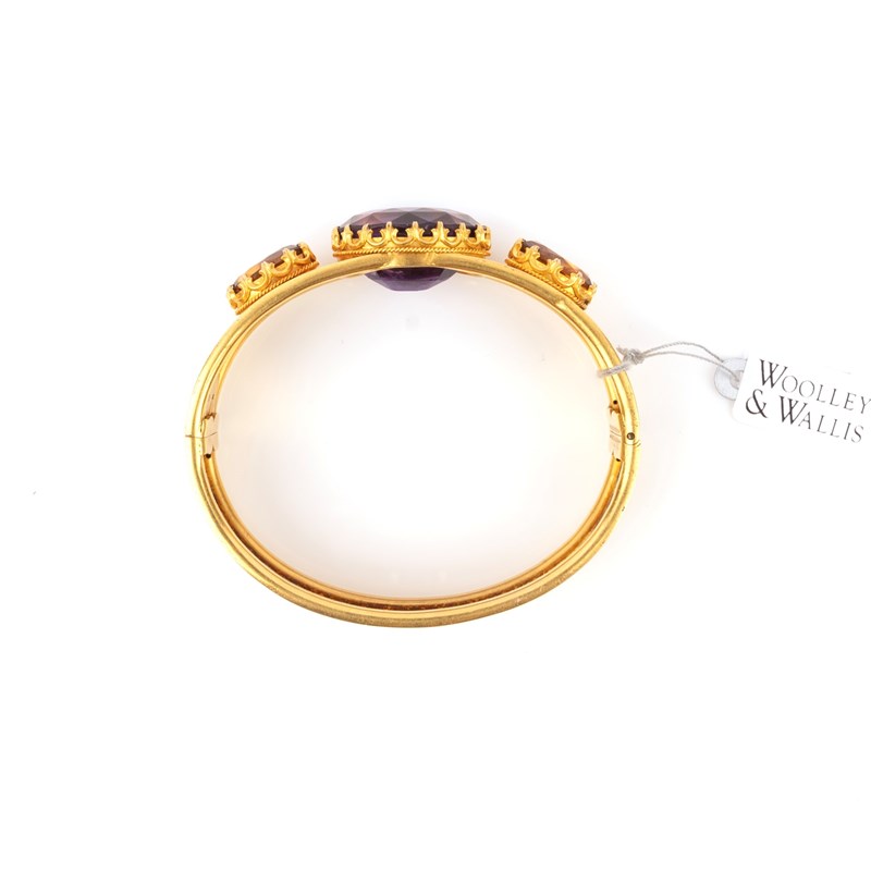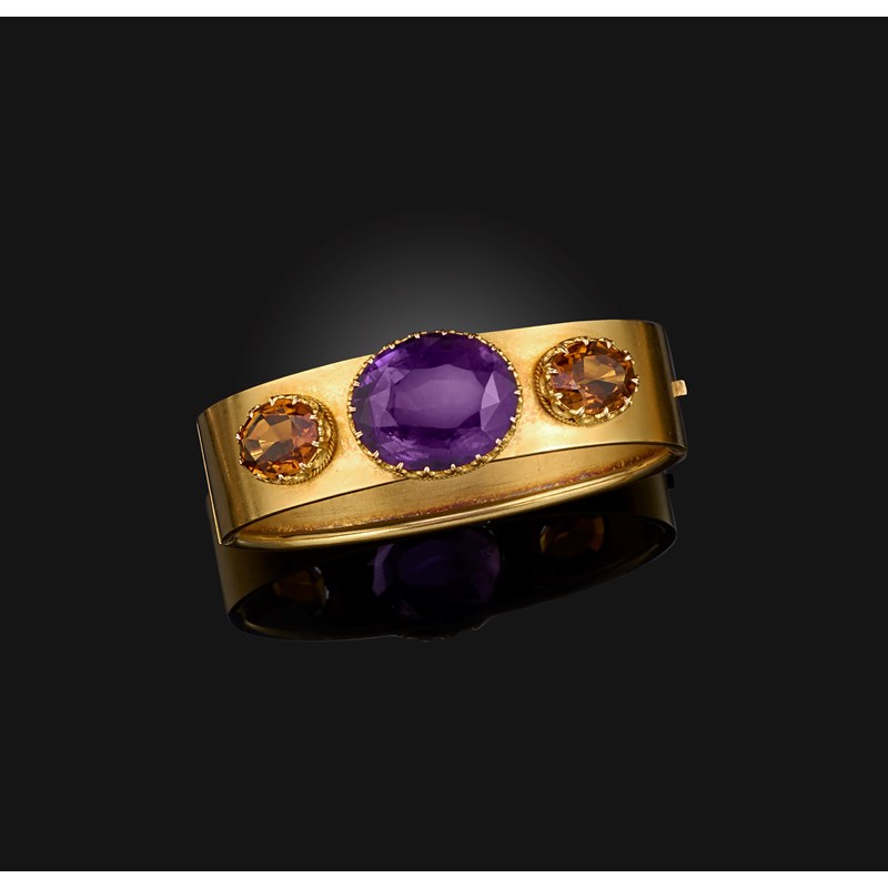 A Victorian amethyst and citrine bangle, set with a central oval-shaped amethyst, flanked with citrines in gold collets on hinged yellow gold bangle, inner circumference 16cm