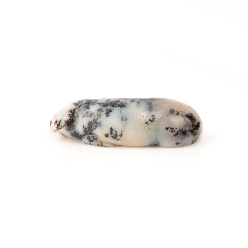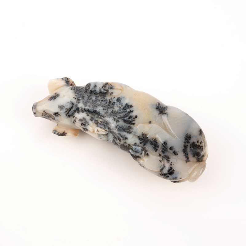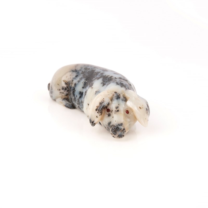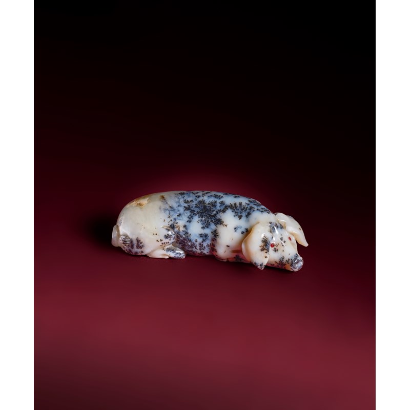 Fabergé, a dendritic agate miniature animal study, early 20th century, realistically modelled as a reclining Gloucester Old Spot pig, finely carved in dendritic agate, its eyes set with cabochons of red paste, measuring 8.0 x 3.0 x 2.1cm, eyes later replacementsThe quality of this carving and the sensitive treatment of its subject compare favourably with a number of hardstone animal studies produced by the workshops of the Russian imperial jeweller Fabergé. Animal carvings are among the jeweller's most celebrated creations, adored and collected by some of the most prominent figures of the early 20th century. Russia's stone carving industry centred on the city of Yekaterinburg, where Fabergé acquired the workshop of lapidary Karl Woerffels around 1884, and it was this workshop that produced the majority of them - the carvers Kremlev, Derbyshev and Svetchnikov, managed by the German Alexander Meier. The stones were carefully selected by Carl Fabergé's son Agathon, and were mostly of Russian origin, taking advantage of the rich mineral resources of the Ural mountains and Siberia. The animal carvings found immense popularity with a number of the firm's key patrons, most notably the British Royal Family, whose collection boasts more than 350 animals, and Léopold de Rothschild, who had his racehorses similarly immortalised by Fabergé's sculptors.The dendritic or 'moss' agate used here is an unusual choice for an animal study, its distinctive patterning more commonly employed by Fabergé for inlays and panels in its jewels and objets de vertu. Traditionally found in India but eventually sourced by Fabergé from Siberia, its use here is likely a clever attempt to mimic the distinct patternings of a particular breed of pig known as the Gloucester Old Spot, whose 'lop' ears are also distinctively forward folding as in the present carving, partially shielding its eyes. A number of realistically modelled farm animals including pigs were produced from life at the Sandringham estate in 1907, following a suggestion made to King Edward VII by Fabergé's London agent Henry Bainbridge that the firm recreate a number of the animals across the estate. With subjects ranging from the King's own terrier dog Caesar, to the cows, pigs, ducks and chickens that populated the farmland around them, the animals of this 'Sandringham Commission' were reproduced in wax sculptures by the carver Boris Frödman-Cluzel, before being sent back to the Russian workshops to be immortalised in hardstone. They were then sent back to Fabergé's London branch for purchase, mostly, but not exclusively, by those who wished to gift them back to the Royal Family. Such was the appeal that some were even acquired by members of the family themselves, such as Princess Victoria, who bought a model of a recumbent white sow in pale pink aventurine quartz in 1912 (RCIN 40041). It is not known whether the present study would have been part of the Sandringham commission, but the close attention to detail and the choice of this lesser known breed of pig reflect a close observation of the animal, likely in its agricultural setting, and a desire by the sculptor to capture the distinctive characteristics of this specific breed. King Edward VII was particularly proud of his pigs and sent the best of his herd to The Royal Society Show in June 1911. Pigs were one of Fabergé's more popular animal studies in their native Russia, with several examples recorded in the collection of Empress Maria Feodorovna, and are also among the most humorous and varied of their miniature sculptures.Cf.: a series of carved hardstone pigs by Fabergé in the Royal Collection, collection nos. RCIN 40041, 40038, 40421 and 40422, commissioned by the Royal Family and studied by Fabergé's sculptor Boris Frödman-Cluzel from life at the Sandringham estate in 1907.Cf.: The Robert Strauss Collection of Works of Art by Fabergé, Christie's, 9th March 1976, lot 28, and A. Kenneth Snowman, The Art of Carl Fabergé, 1972, no.237, for