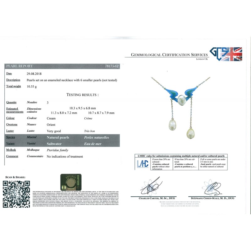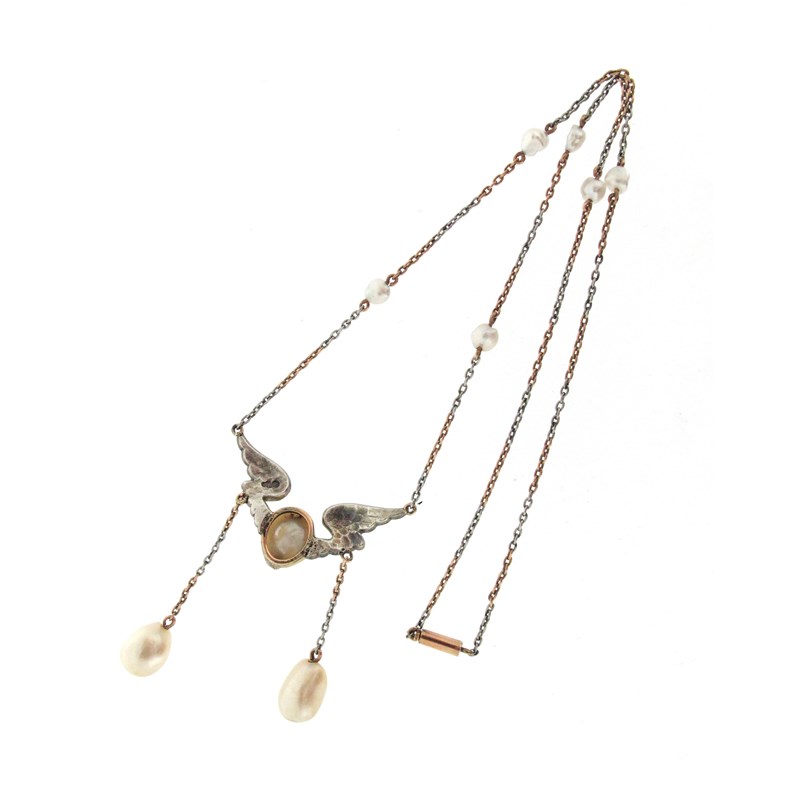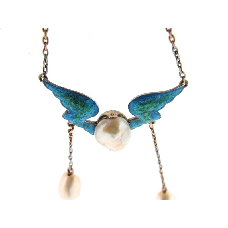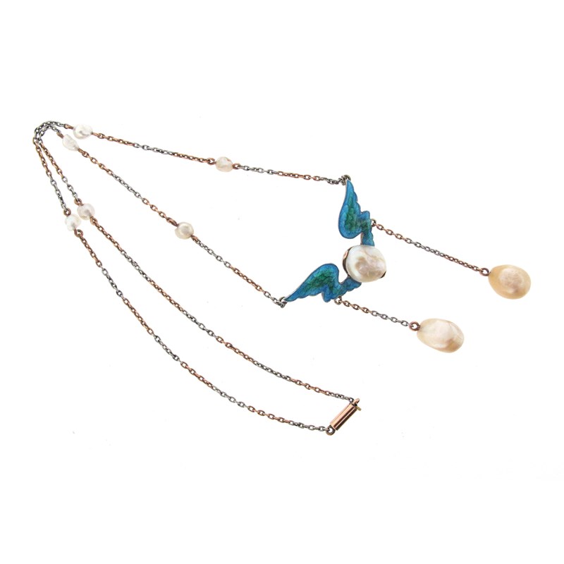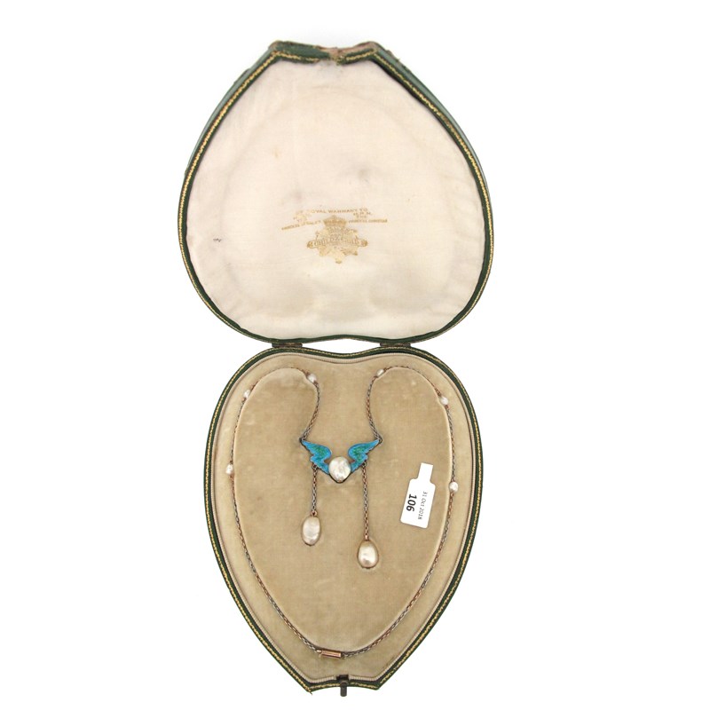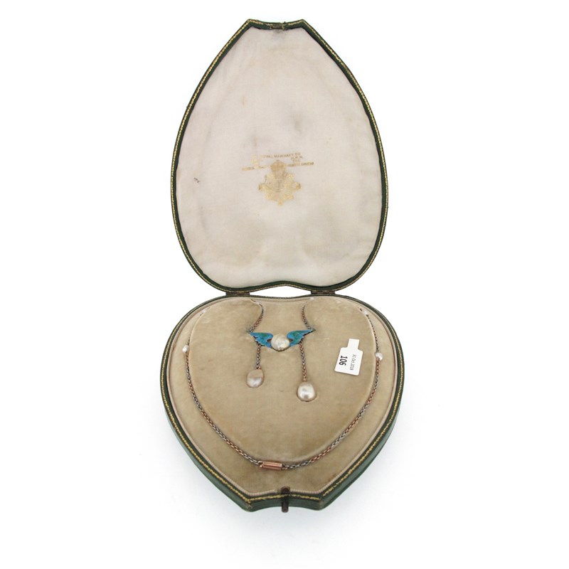An enamel and pearl wings pendant by Child & Child, c1905, decorated with green and blue enamel, set with a pearl in silver and gold and suspending two pearls on fine-link chain, on chain decorated with six baroque pearls, maker's mark, 3.5cm wide, chain 42cm long, fitted case by Child & Child