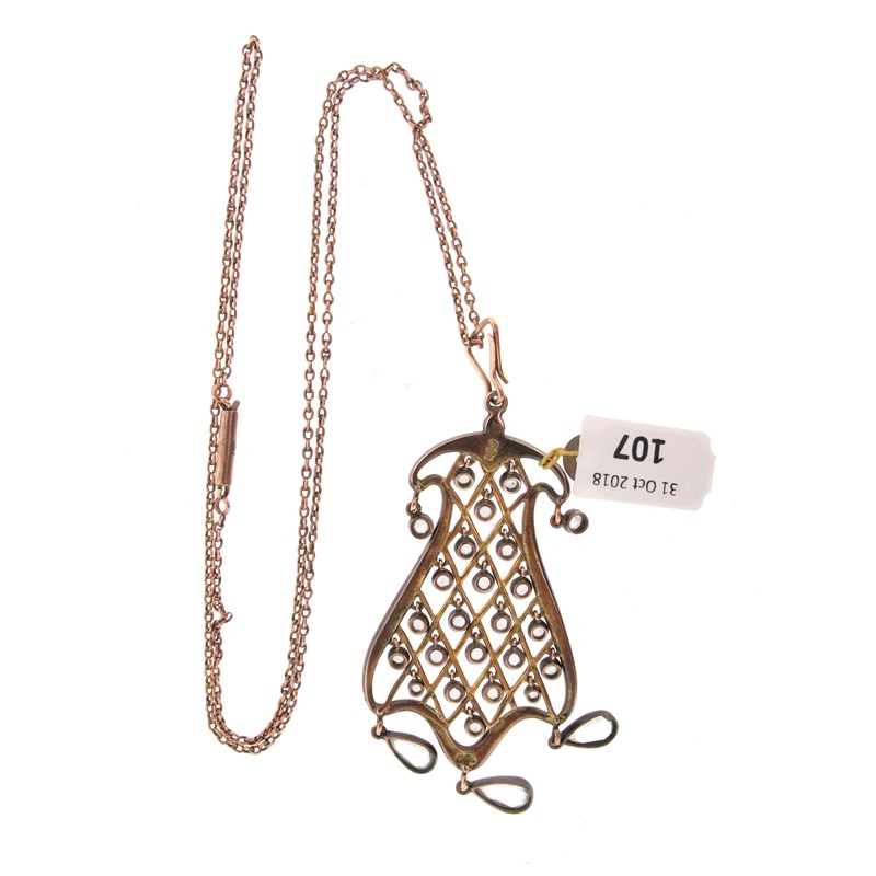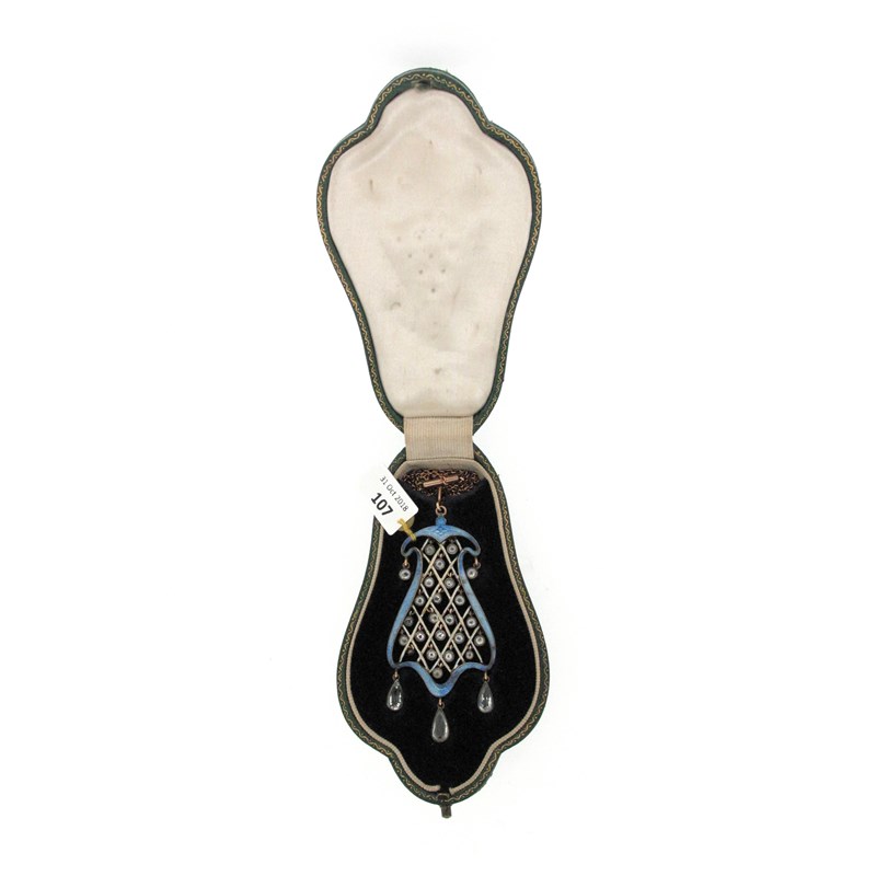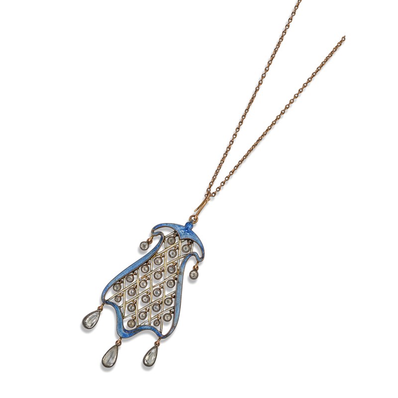 An Art Nouveau blue enamel and goshenite pendant by Child & Child, c1905, of openwork design, the crossed lattice frieze decorated with white enamel and suspending circular-cut goshenite drops, within blue enamel border suspending three pear-shaped goshenites, set in gold on fine-link gold neck chain, maker's mark for Child & Child, pendant 6cm high, chain 50cm long, in fitted case by Child & Child