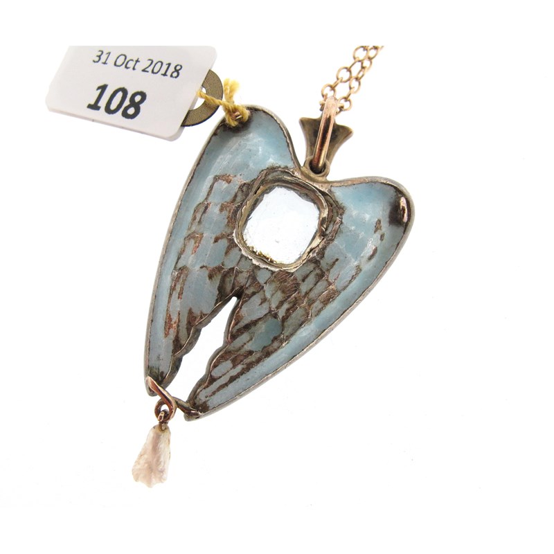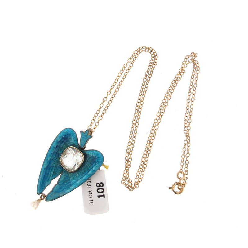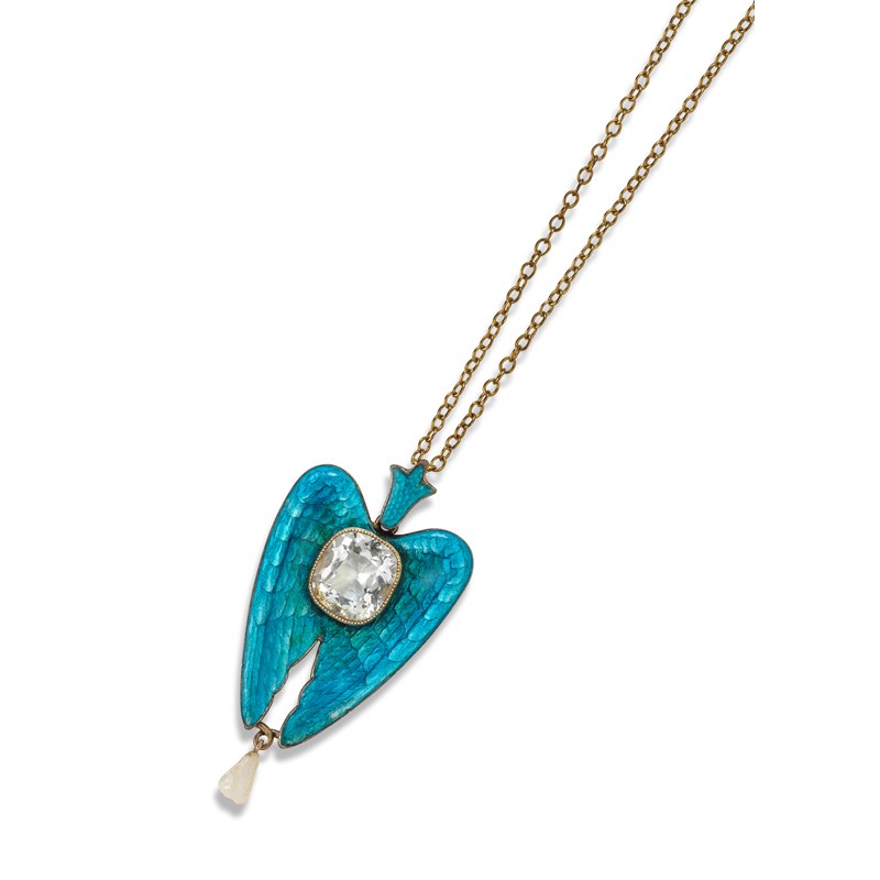 A blue enamel wings pendant attributed to Child & Child, c1905, set with a cushion-shaped goshenite and suspending a seed pearl in yellow gold, blue counter enamel to reverse (damaged), on fine-link gold chain, pendant 4.5cm high, chain 25cm long