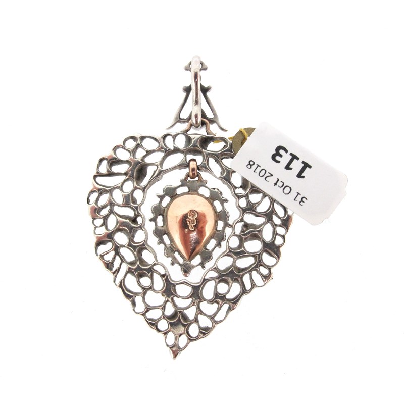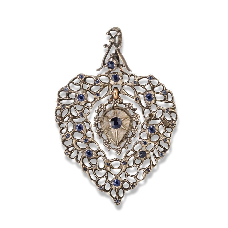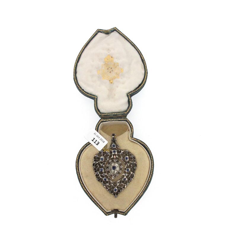 A heart-shaped openwork pendant by Child & Child, c1905, set with ten sapphires and a pear-shaped sapphire set to the articulated centre in silver and gold, maker's mark, 5.4cm high, fitted case by Child & Child
