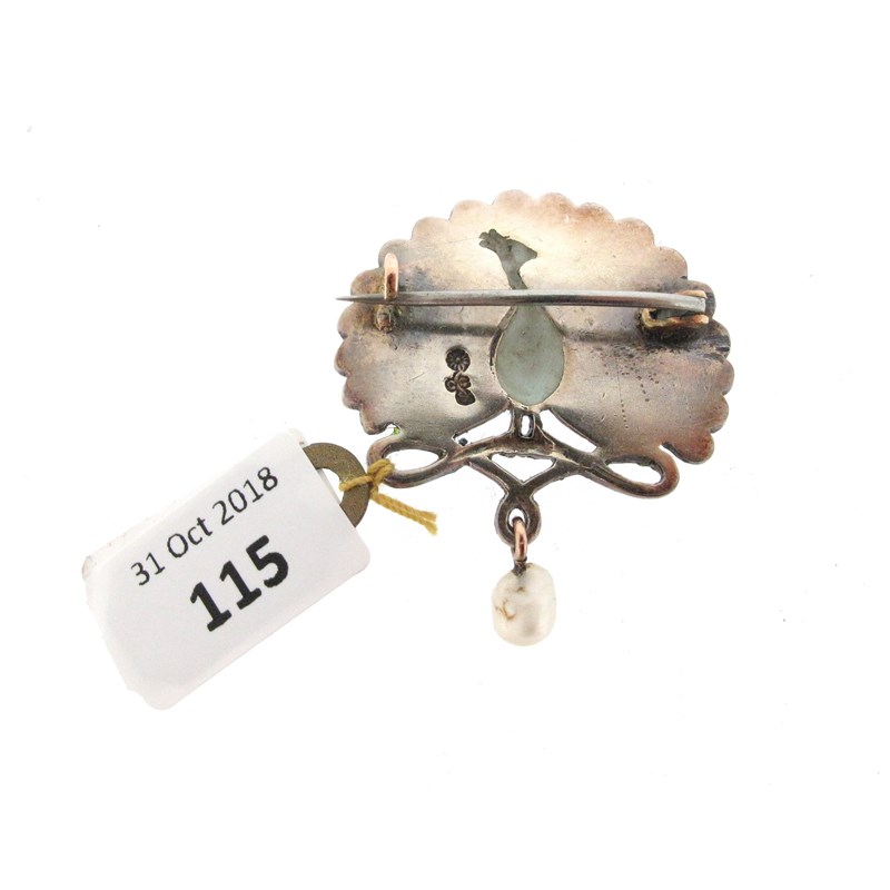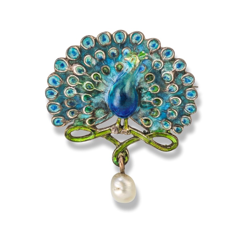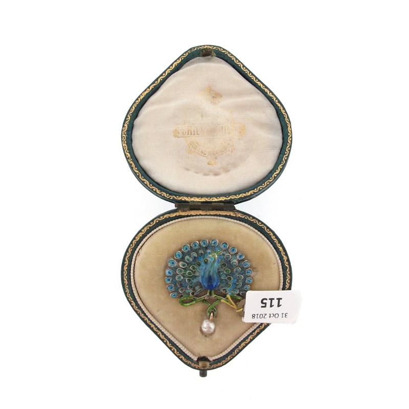 A polychrome enamel peacock brooch by Child & Child, c1905, suspending a baroque pearl in silver and gold, 2.8cm high, maker's mark to reverse, fitted case by Child & Child