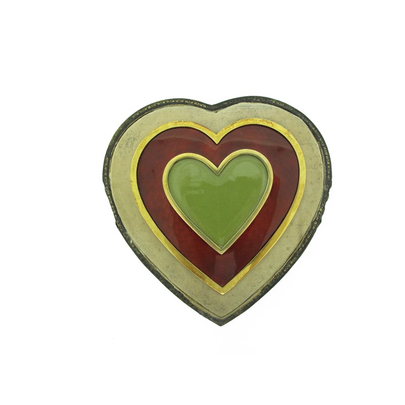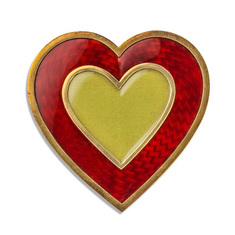 A leather heart-shaped photograph frame by Child & Child, c1900, the removable heart-shaped gilt centre-section with red guilloche enamel ground on heart-shaped aperture, signed to leather frame, frame 12cm, centre 9cm