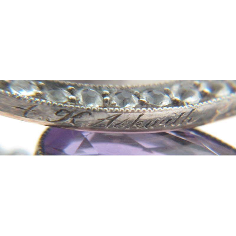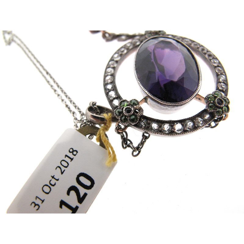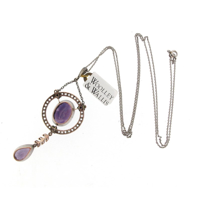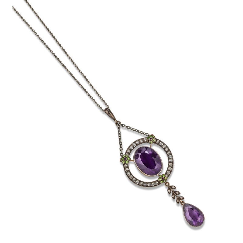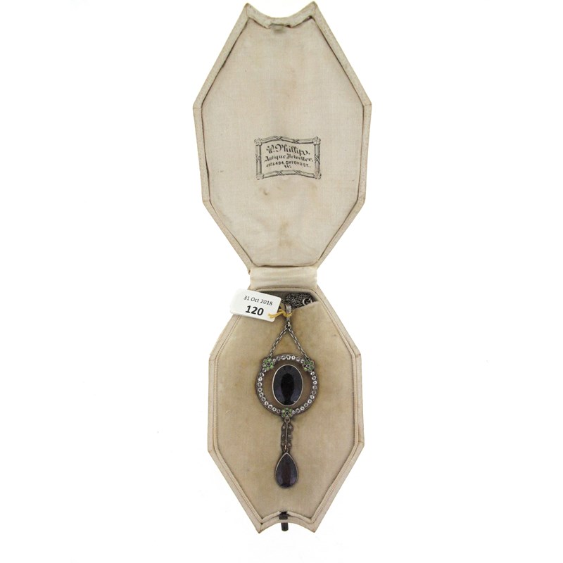An amethyst, demantoid garnet and white sapphire Suffragette pendant by Child & Child, c1920, the centre oval-shaped amethyst set within a circular frame of circular-cut white sapphires and flowerhead clusters of demantoid garnets (one stone missing), suspending a further pear-shaped amethyst drop from a foliate link set with rose-cut diamonds, engraved 'A.K. Askwith from the Witton-le-Wear W.I. 1921, and with maker's mark, 7.3cm high, with fitted case by W Phillips