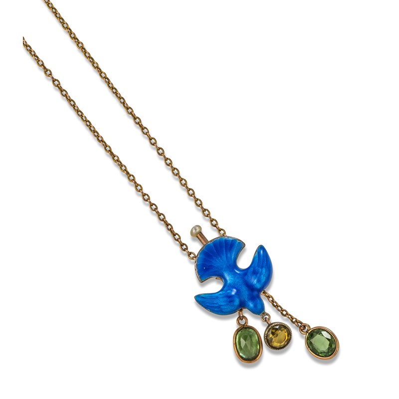 A green stone and blue enamel dove pendant by Child & Child