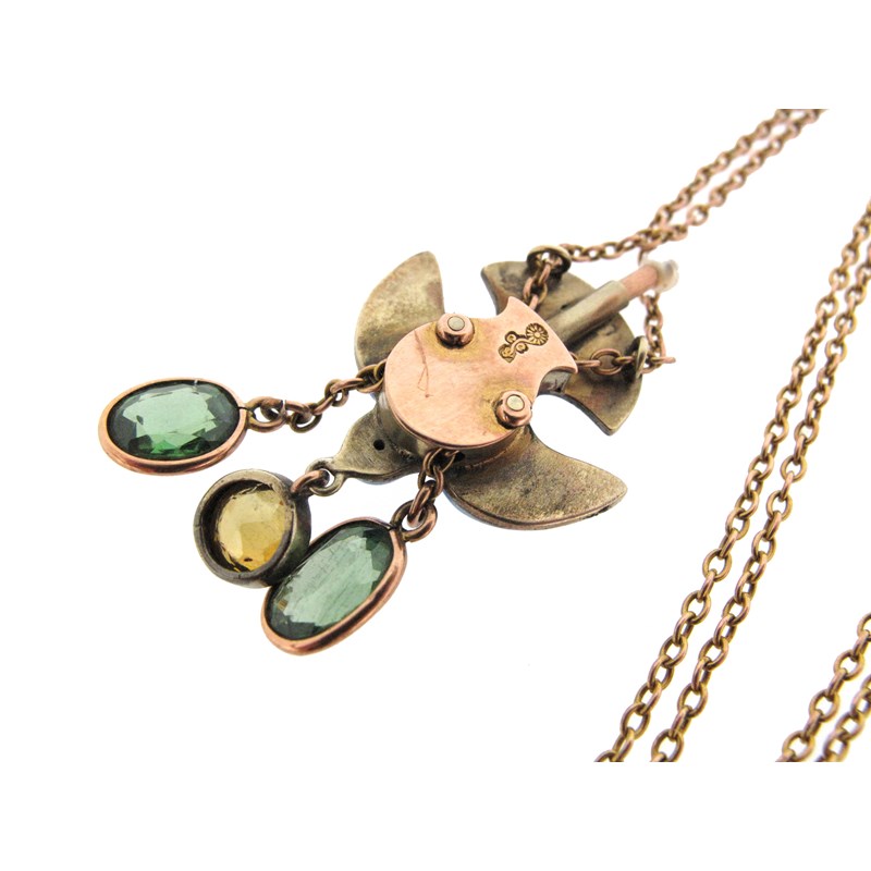 A green stone and blue enamel dove pendant by Child & Child, c1905, the stylised dove suspends a circular-cut citrine, mounted on an adjustable clasp terminating with oval green tourmaline finials in gold, maker's mark for Child & Child, dove 40mm high, chain 60cm long