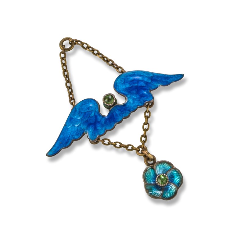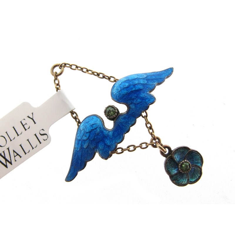 A blue enamel wings pendant by Child & Child, c1905, set with a demantoid garnet and suspending a flowerhead pendant set with a demantoid garnet in silver and gold, maker's mark, 3.5cm wide