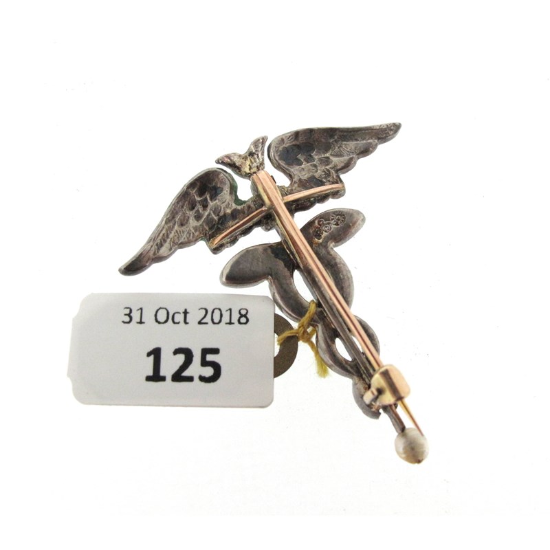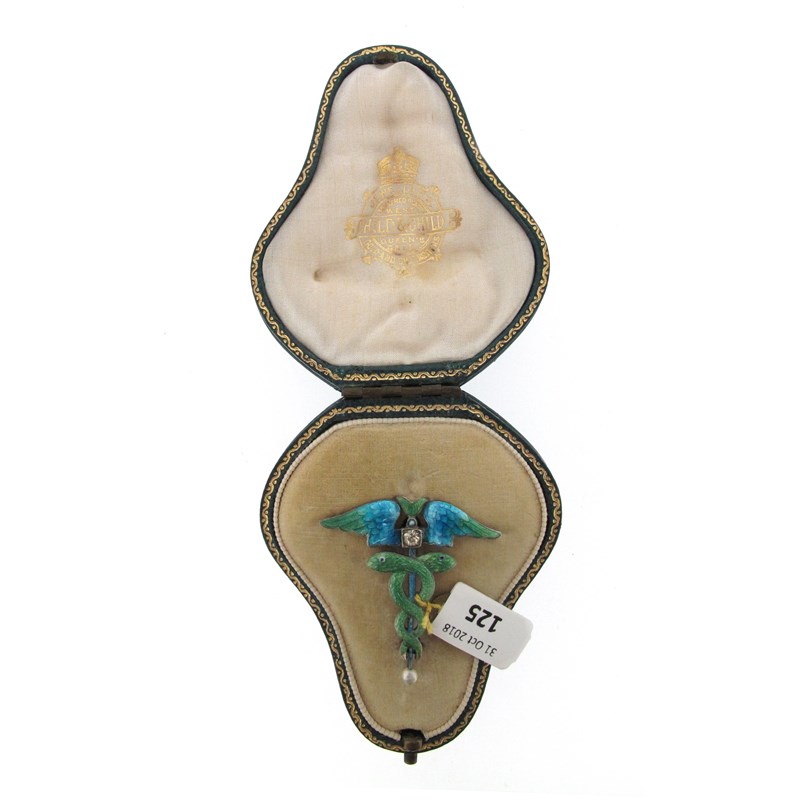A green enamel caduceus brooch by Child & Child, c1905, decorated with green and blue enamel, white paste and a seed pearl in silver and gold, maker's mark for Child & Child, 3.5cm high, fitted case by Child & Child