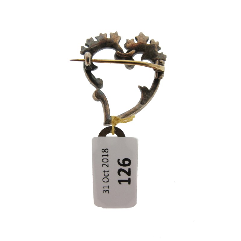 A green enamel heart-shaped brooch by Child & Child, c1905, of openwork design within green enamel decorated frame in gold, maker's mark for Child & Child, 2.5cm high, fitted case by Child & Child