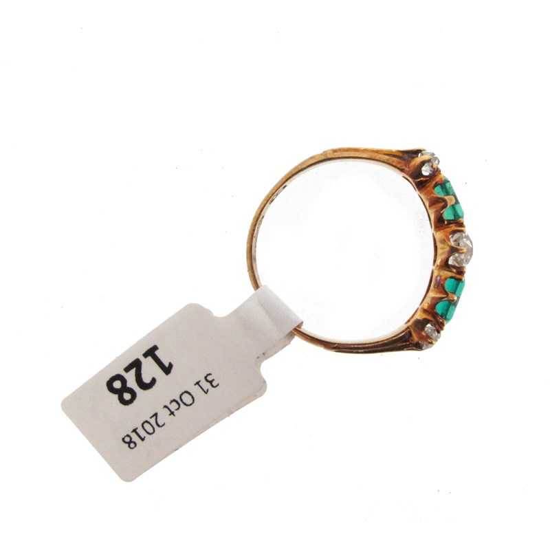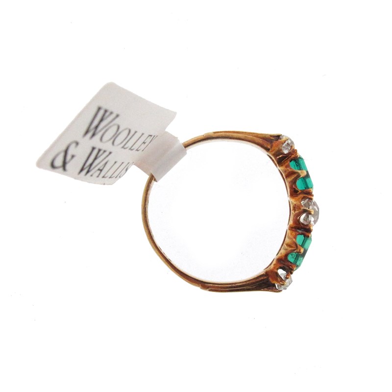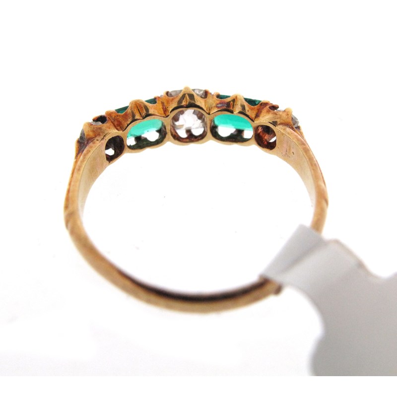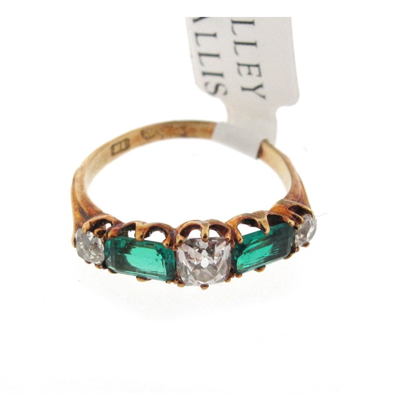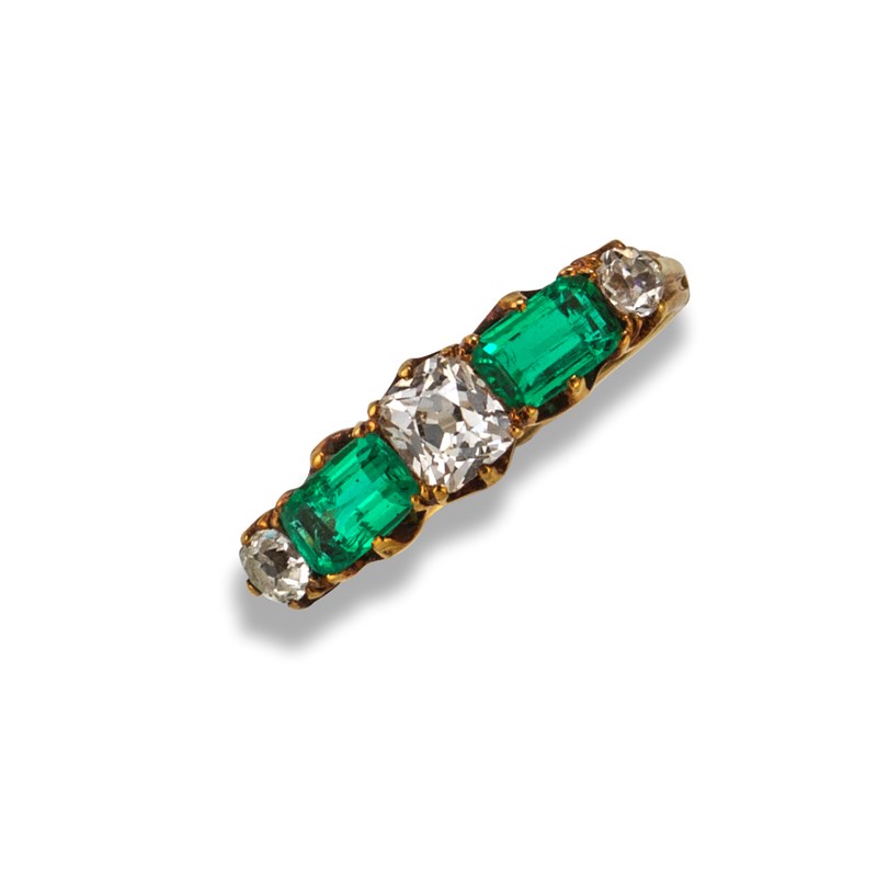 An emerald and diamond five-stone ring by Child & Child, c1900, alternately-set with emerald-cut emeralds and cushion-shaped diamonds in yellow gold, maker's mark, size N 1/2