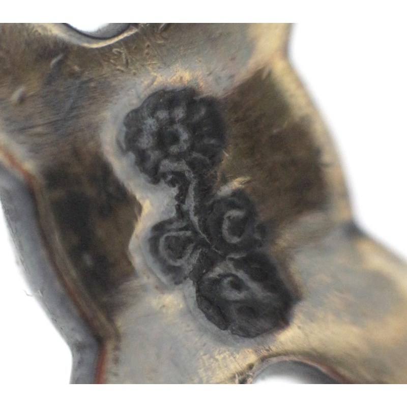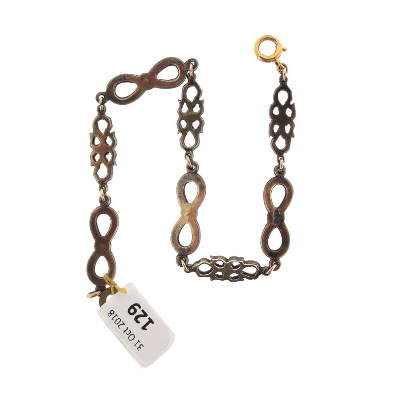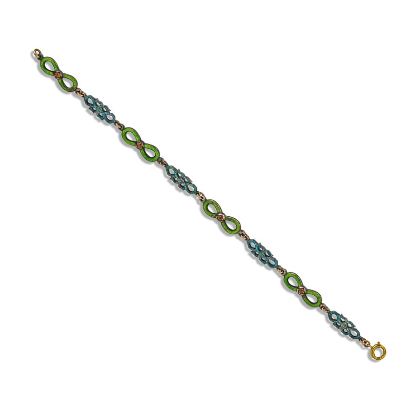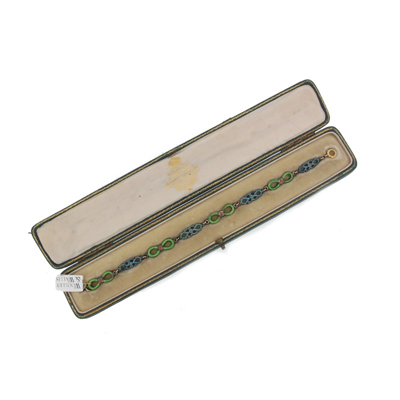 A polychrome enamel bracelet by Child & Child, c1905, comprising alternating green figure of eight links set with orange stones and blue enamel ribbons in silver and gold, 20cm long, makers mark, in fitted case by Child & Child