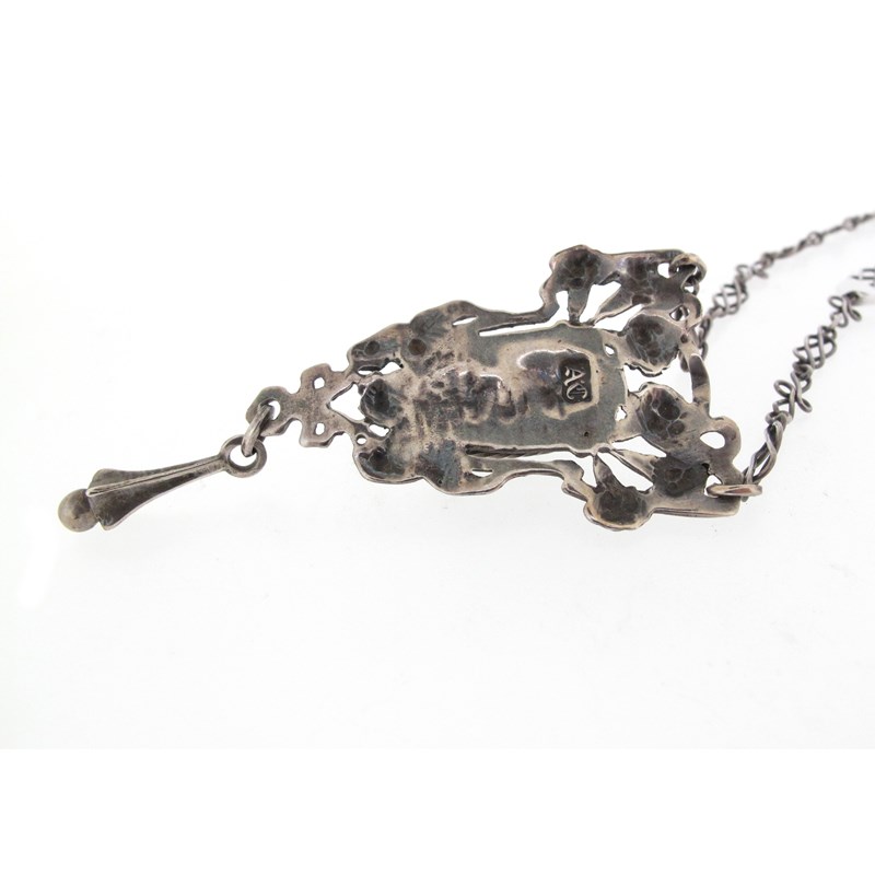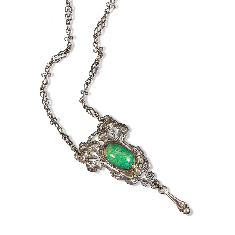 An Arts & Crafts silver pendant by Alwyn Carr, c1920, of naturalistic design and set with a turquoise cabochon, suspending an elongated silver drop, on twisted link silver chain, maker's mark to reverse, pendant 7cm, chain 42cm, case