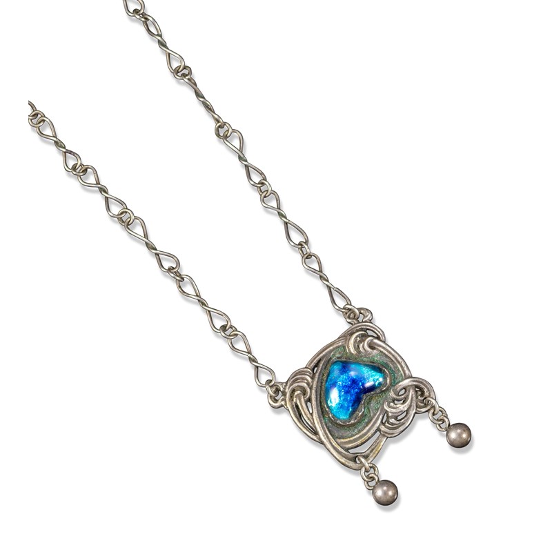 An Arts & Crafts silver pendant by Ramsden & Carr, the blue enamel inverted heart within silver scroll surround, suspending sphere drops, engraved to reverse St. Dunstan's Studio May 16 1905, London hallmarks for 1904, maker's mark, pendant 4.7cm long, 42cm long