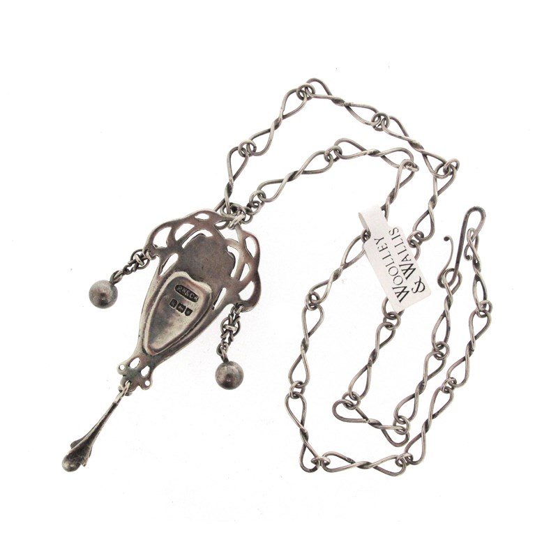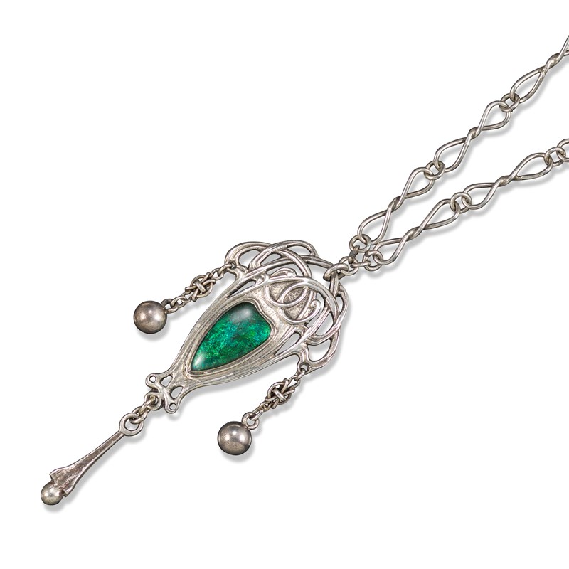 An Arts & Crafts silver and enamel pendant by Ramsden & Carr, the heart-shaped green plaque within silver scroll border suspending two silver spheres and an elongated silver drop, on twisted-link silver chain, London hallmarks for 1905, maker's mark, pendant 7.5cm long, chain 45cm long, Didier case