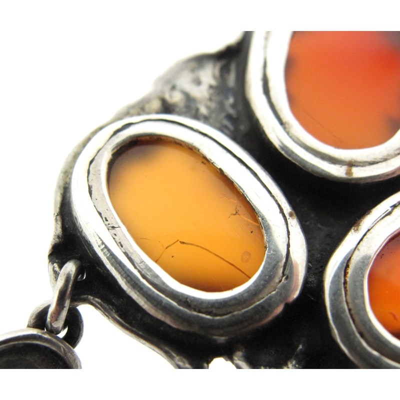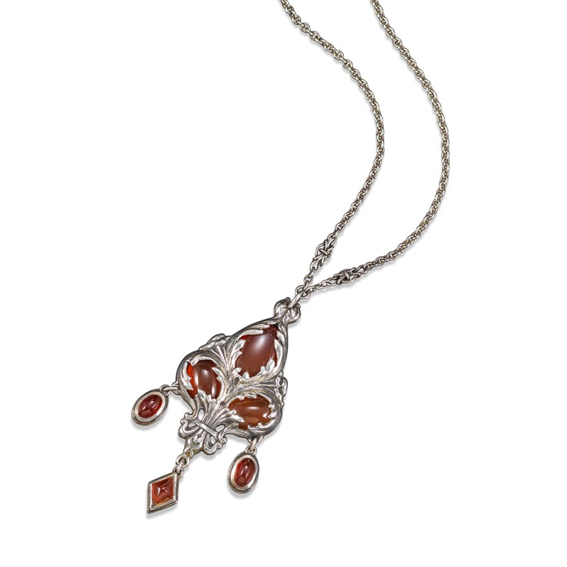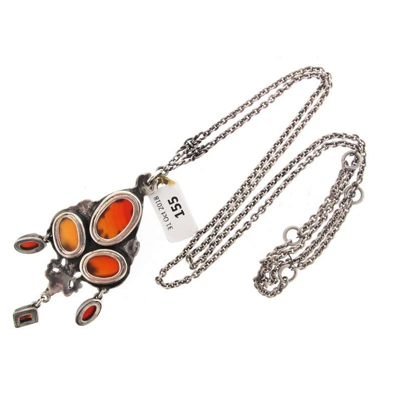 An Arts & Crafts silver pendant attributed to Omar Ramsden, c1925, set with three carnelian cabochons in scrolling trefoil formation, suspending a kite-shape carnelian drop and two oval drops, on an oval-link silver chain with double back section, pendant 7.5cm long, chain 62cm long, original fitted Omar Ramsden case